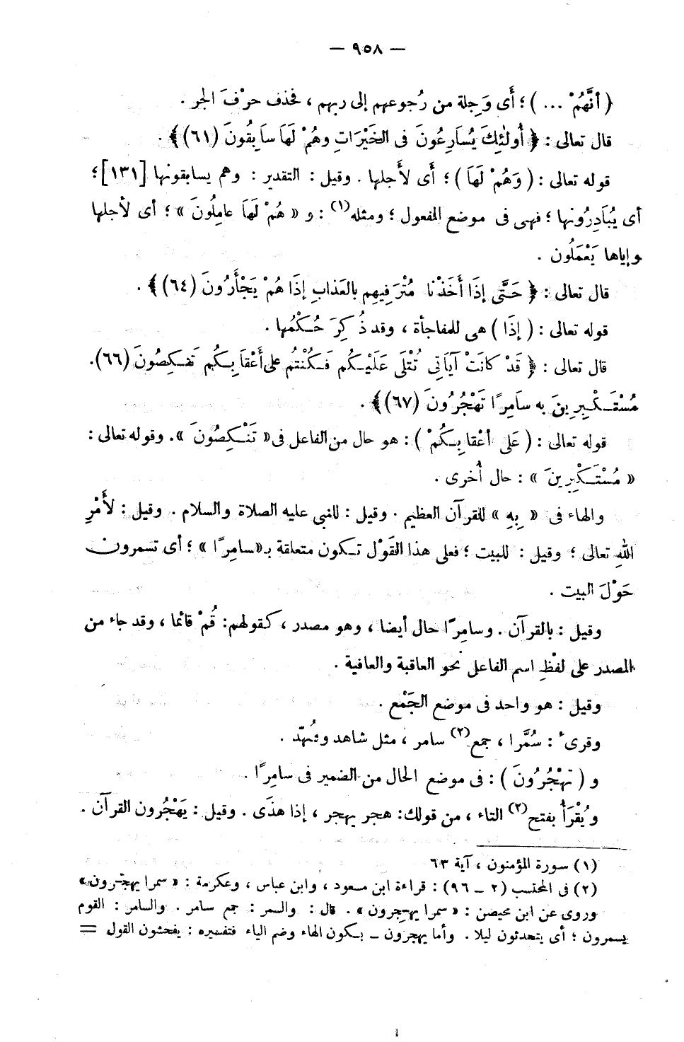 قَالَ تَعَالَى: (قَدْ كَانَتْ آيَاتِي تُتْلَى عَلَيْكُمْ فَكُنْتُمْ عَلَى أَعْقَابِكُمْ تَنْكِصُونَ (66) مُسْتَكْبِرِينَ بِهِ سَامِرًا تَهْجُرُونَ (67)) .