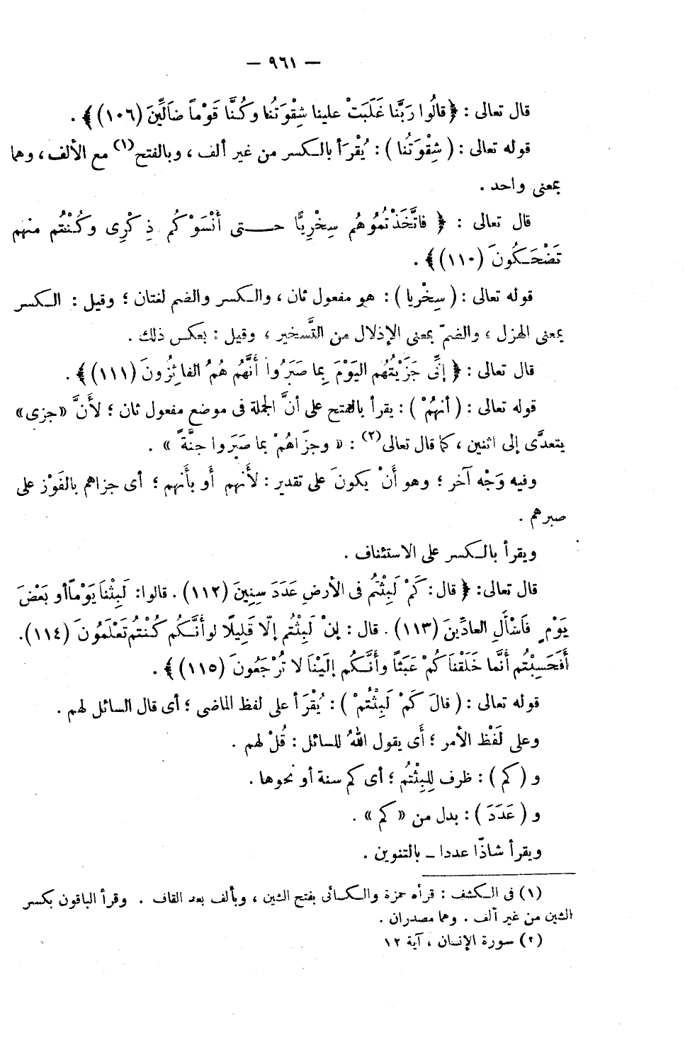 قَوْلُهُ تَعَالَى: (سِخْرِيًّا) : هُوَ مَفْعُولٌ ثَانٍ، وَالْكَسْرُ وَالضَّمُّ لُغَتَانِ ; وَقِيلَ: الْكَسْرُ بِمَعْنَى الْهَزْلِ، وَالضَّمُّ بِمَعْنَى الْإِذْلَالِ مِنَ التَّسْخِيرِ، وَقِيلَ: بِعَكْسِ ذَلِكَ.