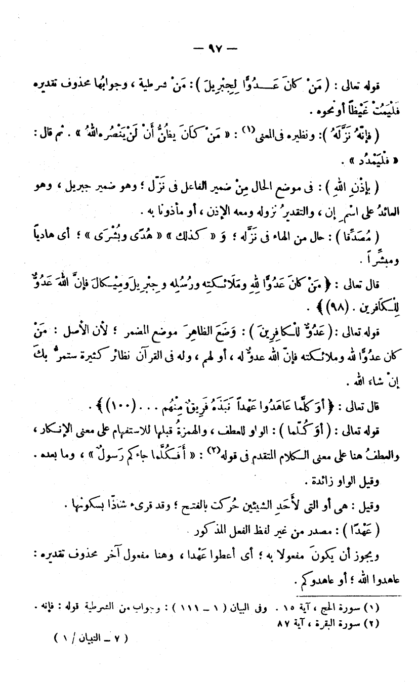 قَوْلُهُ تَعَالَى: (مَنْ كَانَ عَدُوًّا لِجِبْرِيلَ) [الْبَقَرَةِ: 87] مِنْ شَرْطِيَّةٌ، وَجَوَابُهَا مَحْذُوفٌ تَقْدِيرُهُ فَلْيَمُتْ غَيْظًا أَوْ نَحْوُهُ. (فَإِنَّهُ نَزَّلَهُ) : وَنَظِيرُهُ فِي الْمَعْنَى: (مَنْ كَانَ يَظُنُّ أَنْ لَنْ يَنْصُرَهُ اللَّهُ) [الْحَجِّ: 15] ثُمَّ قَالَ: ((فَلْيَمْدُدْ)) : ((بِإِذْنِ اللَّهِ)) فِي مَوْضِعِ الْحَالِ مِنْ ضَمِيرِ الْفَاعِلِ فِي نَزَّلَ ; وَهُوَ ضَمِيرُ جِبْرِيلَ، وَهُوَ الْعَائِدُ عَلَى اسْمِ إِنَّ، وَالتَّقْدِيرُ: نُزُولُهُ وَمَعَهُ الْإِذْنُ أَوْ مَأْذُونًا بِهِ.