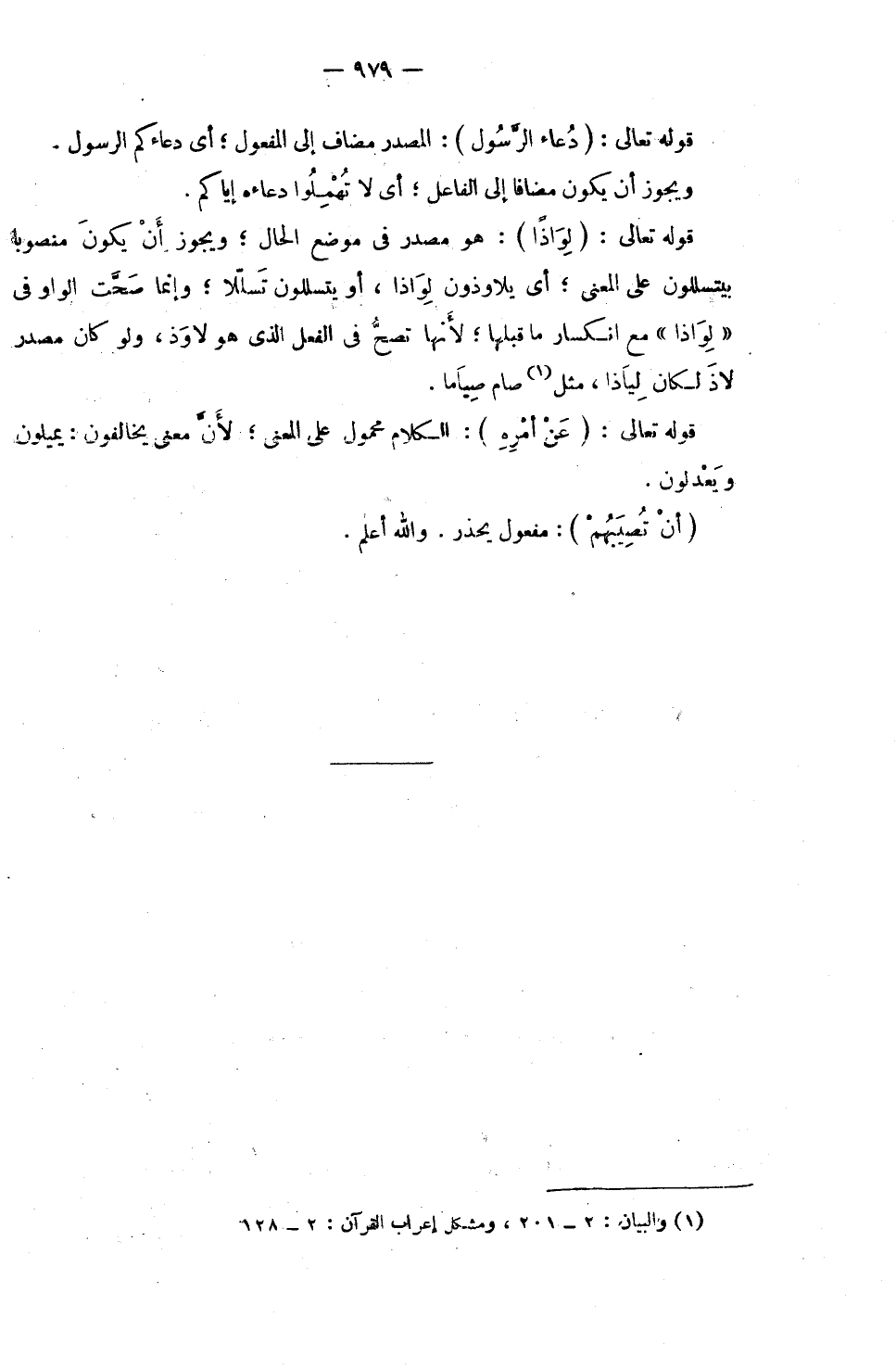 قَوْلُهُ تَعَالَى: (دُعَاءَ الرَّسُولِ) : الْمَصْدَرُ مُضَافٌ إِلَى الْمَفْعُولِ؛ أَيْ دُعَاءَكُمُ الرَّسُولَ. وَيَجُوزُ أَنْ يَكُونَ مُضَافًا إِلَى الْفَاعِلِ؛ أَيْ لَا تُهْمِلُوا دُعَاءَهُ إِيَّاكُمْ.