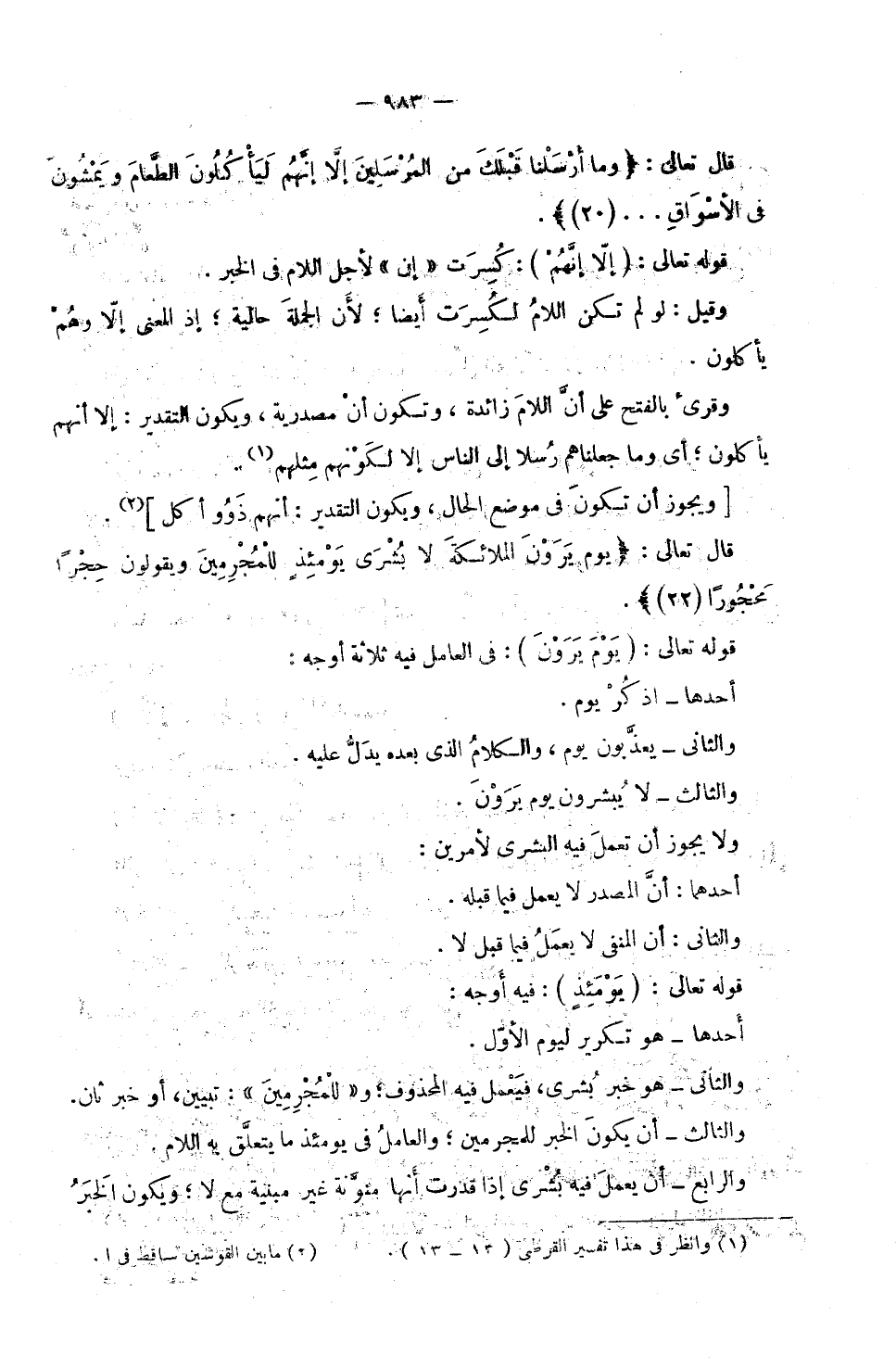 وَالثَّانِي: هُوَ خَبَرُ بُشْرَى، فَيَعْمَلُ فِيهِ الْمَحْذُوفُ؛ وَ «لِلْمُجْرِمِينَ» : تَبْيِينٌ، أَوْ خَبَرٌ ثَانٍ. وَالثَّالِثُ: أَنْ يَكُونَ الْخَبَرُ «لِلْمُجْرِمِينَ» وَالْعَامِلُ فِي يَوْمَئِذٍ مَا يَتَعَلَّقُ بِهِ اللَّامُ.