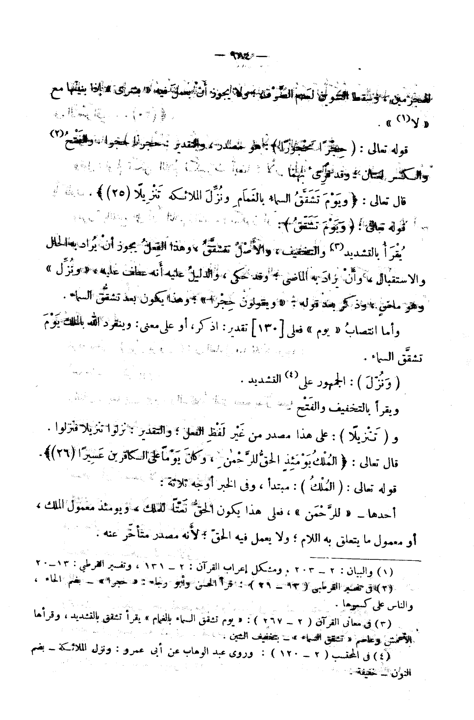 يُقْرَأُ بِالتَّشْدِيدِ وَالتَّخْفِيفِ، وَالْأَصْلُ تَنْشَقُّ، وَهَذَا الْفِعْلُ يَجُوزُ أَنْ يُرَادَ بِهِ الْحَالُ وَالِاسْتِقْبَالُ، وَأَنْ يُرَادَ بِهِ الْمَاضِي؛ وَقَدْ حُكِيَ، وَالدَّلِيلُ عَلَيْهِ أَنَّهُ عُطِفَ عَلَيْهِ: وَ «نُزِّلَ» وَهُوَ مَاضٍ، وَذُكِرَ بَعْدَ قَوْلِهِ: «وَيَقُولُونَ حِجْرًا» وَهَذَا يَكُونُ بَعْدَ تَشَقُّقِ السَّمَاءِ.