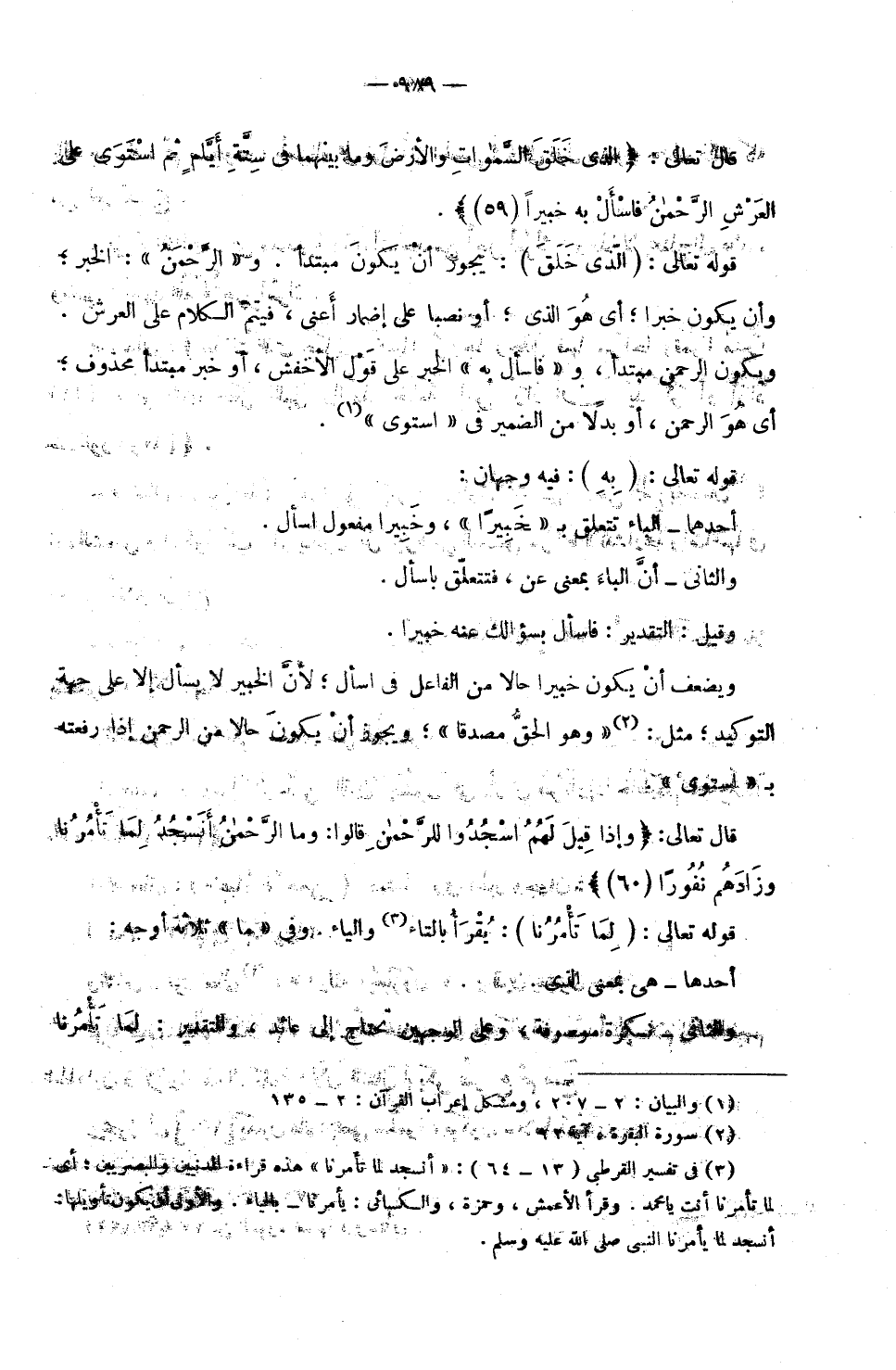 قَوْلُهُ تَعَالَى: (الَّذِي خَلَقَ) : يَجُوزُ أَنْ يَكُونَ مُبْتَدَأً. وَ «الرَّحْمَنُ» : الْخَبَرُ؛ وَأَنْ يَكُونَ خَبَرًا؛ أَيْ هُوَ الَّذِي؛ أَوْ نَصْبًا عَلَى إِضْمَارِ أَعْنِي فَيَتِمُّ الْكَلَامُ عَلَى الْعَرْشِ. وَيَكُونُ «الرَّحْمَنُ» مُبْتَدَأً، وَ «فَاسْأَلْ بِهِ» : الْخَبَرُ، عَلَى قَوْلِ الْأَخْفَشِ، أَوْ خَبَرَ مُبْتَدَأٍ مَحْذُوفٍ؛ أَيْ هُوَ الرَّحْمَنُ، أَوْ بَدَلًا مِنَ الضَّمِيرِ فِي «اسْتَوَى» .