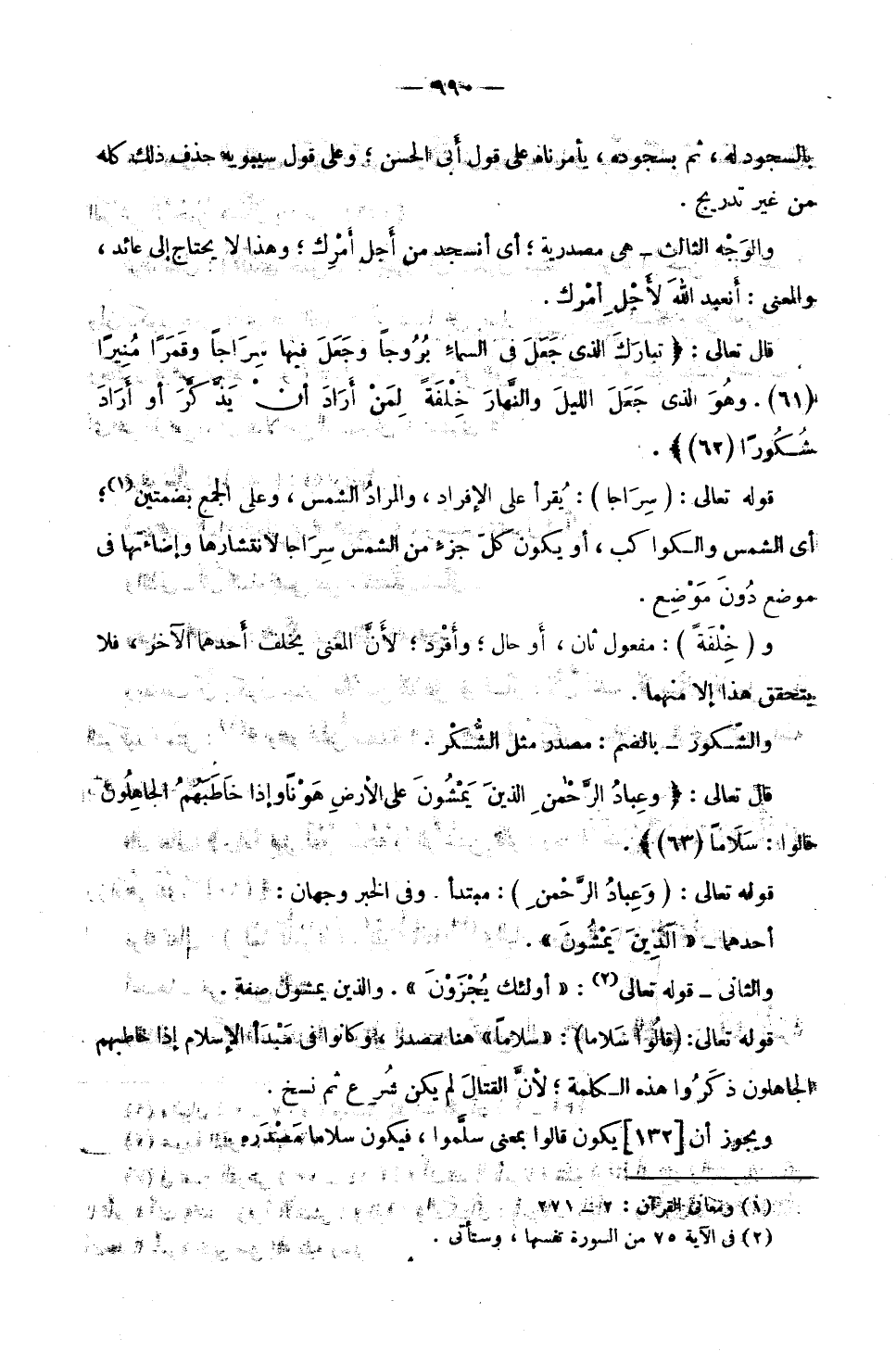 قَوْلُهُ تَعَالَى: (وَعِبَادُ الرَّحْمَنِ) : مُبْتَدَأٌ. وَفِي الْخَبَرِ وَجْهَانِ؛ أَحَدُهُمَا: «الَّذِينَ يَمْشُونَ» وَالثَّانِي: قَوْلُهُ تَعَالَى: «أُولَئِكَ يُجْزَوْنَ» وَ «الَّذِينَ يَمْشُونَ» صِفَةٌ.