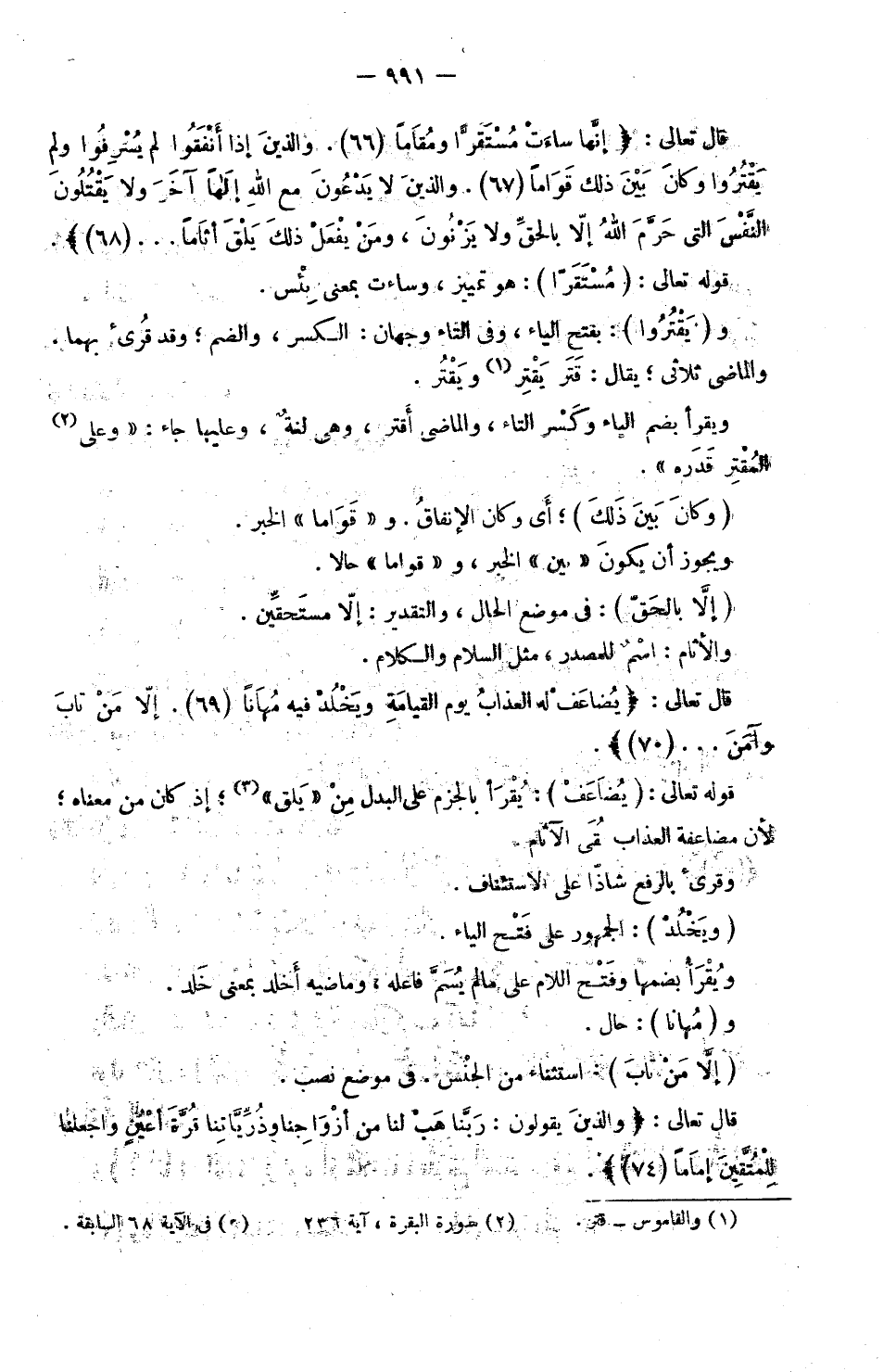 قَالَ تَعَالَى: (إِنَّهَا سَاءَتْ مُسْتَقَرًّا وَمُقَامًا (66) وَالَّذِينَ إِذَا أَنْفَقُوا لَمْ يُسْرِفُوا وَلَمْ يَقْتُرُوا وَكَانَ بَيْنَ ذَلِكَ قَوَامًا (67) وَالَّذِينَ لَا يَدْعُونَ مَعَ اللَّهِ إِلَهًا آخَرَ وَلَا يَقْتُلُونَ النَّفْسَ الَّتِي حَرَّمَ اللَّهُ إِلَّا بِالْحَقِّ وَلَا يَزْنُونَ وَمَنْ يَفْعَلْ ذَلِكَ يَلْقَ أَثَامًا (68)) .