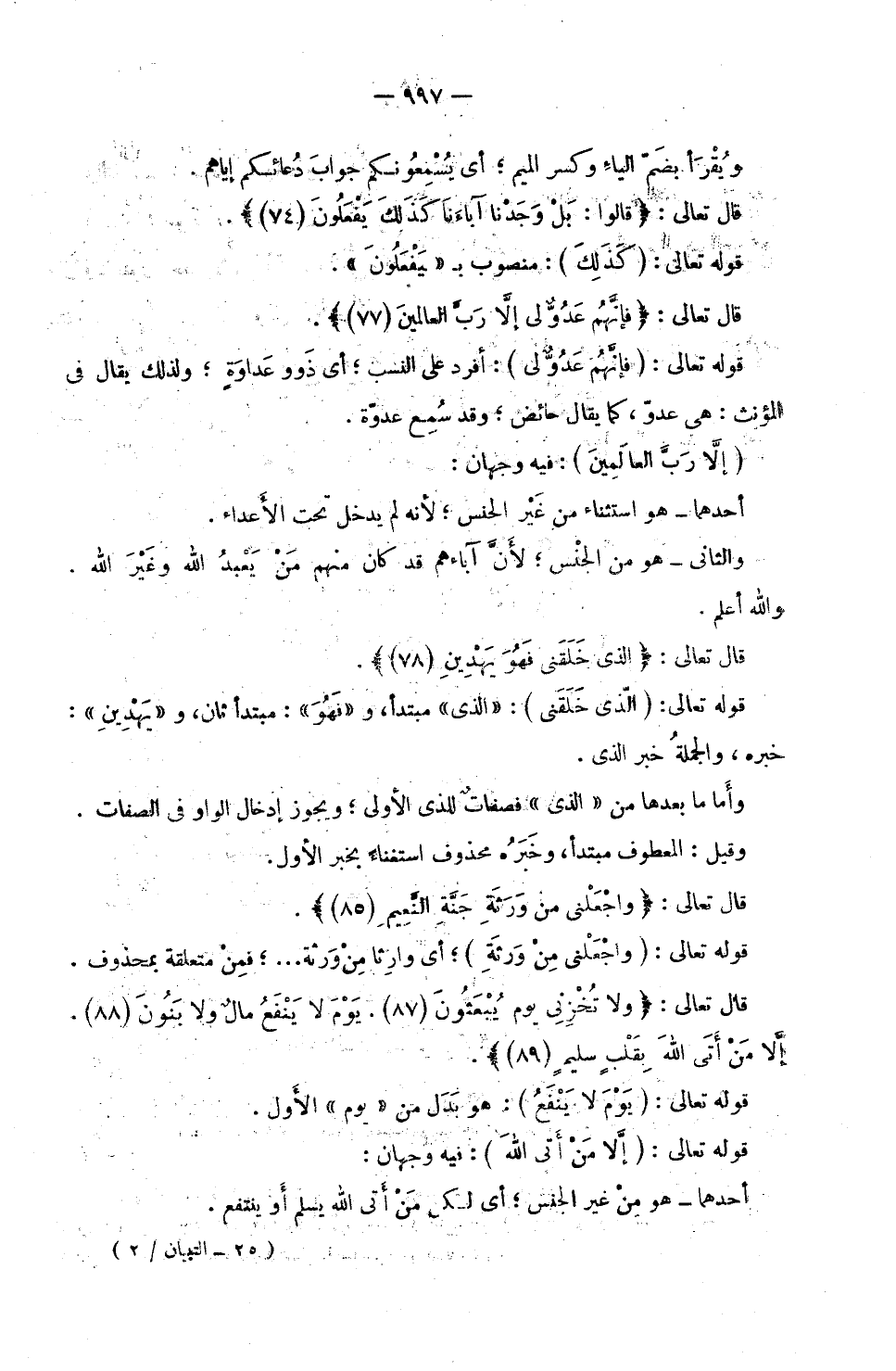 (إِلَّا رَبَّ الْعَالَمِينَ) : فِيهِ وَجْهَانِ؛ أَحَدُهُمَا: هُوَ اسْتِثْنَاءٌ مِنْ غَيْرِ الْجِنْسِ؛ لِأَنَّهُ لَمْ يَدْخُلْ تَحْتَ الْأَعْدَادِ. وَالثَّانِي: هُوَ مِنِ الْجِنْسِ؛ لِأَنَّ آبَاءَهُمْ قَدْ كَانَ مِنْهُمْ مَنْ يَعْبُدُ اللَّهَ وَغَيْرَ اللَّهِ. وَاللَّهُ أَعْلَمُ.