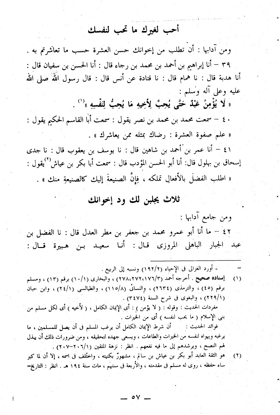 39 - أنَا إِبْرَاهِيمُ بْنُ أَحْمَدَ بْنِ مُحَمَّدِ بْنِ رَجَاءٍ قَالَ: أنَا الْحَسَنُ بْنُ سُفْيَانَ قَالَ: أنَا هُدْبَةُ قَالَ: نَا هَمَّامٌ قَالَ: نَا قَتَادَةُ، عَنْ أَنَسٍ قَالَ: قَالَ رَسُولُ اللَّهِ صَلَّى اللَّهُ عَلَيْهِ وَعَلَى آلِهِ وَسَلَّمَ: §«لَا يُؤْمِنُ عَبْدٌ حَتَّى يُحِبَّ لِأَخِيهِ مَا يُحِبُّ لِنَفْسِهِ»