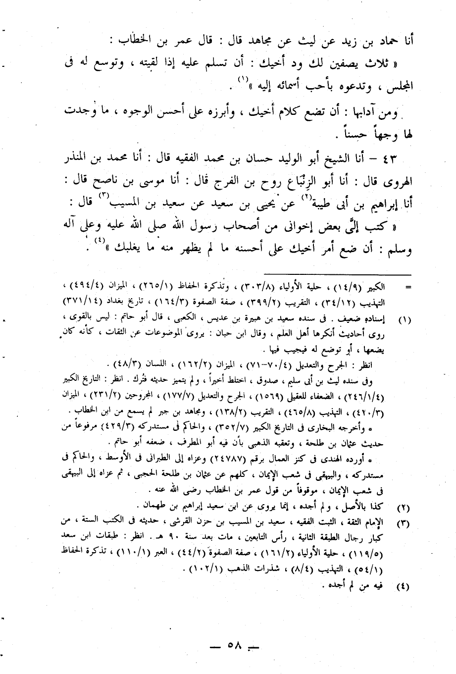 43 - أنا الشَّيْخُ أَبُو الْوَلِيدِ حَسَّانُ بْنُ مُحَمَّدٍ الْفَقِيهُ قَالَ: أنا مُحَمَّدُ بْنُ الْمُنْذِرِ الْهَرَوِيُّ قَالَ: أنا أَبُو الزِّنْبَاعِ رَوْحُ بْنُ الْفَرَجِ قَالَ: أنا مُوسَى بْنُ نَاصِحٍ قَالَ: أنا إِبْرَاهِيمُ بْنُ أَبِي طَيْبَةَ، عَنْ يَحْيَى بْنِ سَعِيدٍ، عَنْ سَعِيدِ بْنِ الْمُسَيِّبِ قَالَ: كَتَبَ إِلَيَّ بَعْضُ إِخْوَانِي مِنْ أَصْحَابِ رَسُولِ اللَّهِ صَلَّى اللَّهُ عَلَيْهِ وَعَلَى آلِهِ وَسَلَّمَ: «أَنْ §ضَعْ أَمْرَ أَخِيكَ عَلَى أَحْسَنِهِ، مَا لَمْ يَظْهَرْ مِنْهُ مَا يَغْلِبُكَ» -[59]- وَمِنْ آدَابِهَا: السُّؤَالُ عَنْ أَسْمَاءِ الْإِخْوَانِ، وَعَنْ أَسْمَاءِ آبَائِهِمْ، وَعَنْ مَنَازِلِهِمْ لِئَلَّا تُقَصِّرَ فِي حُقُوقِهِمْ