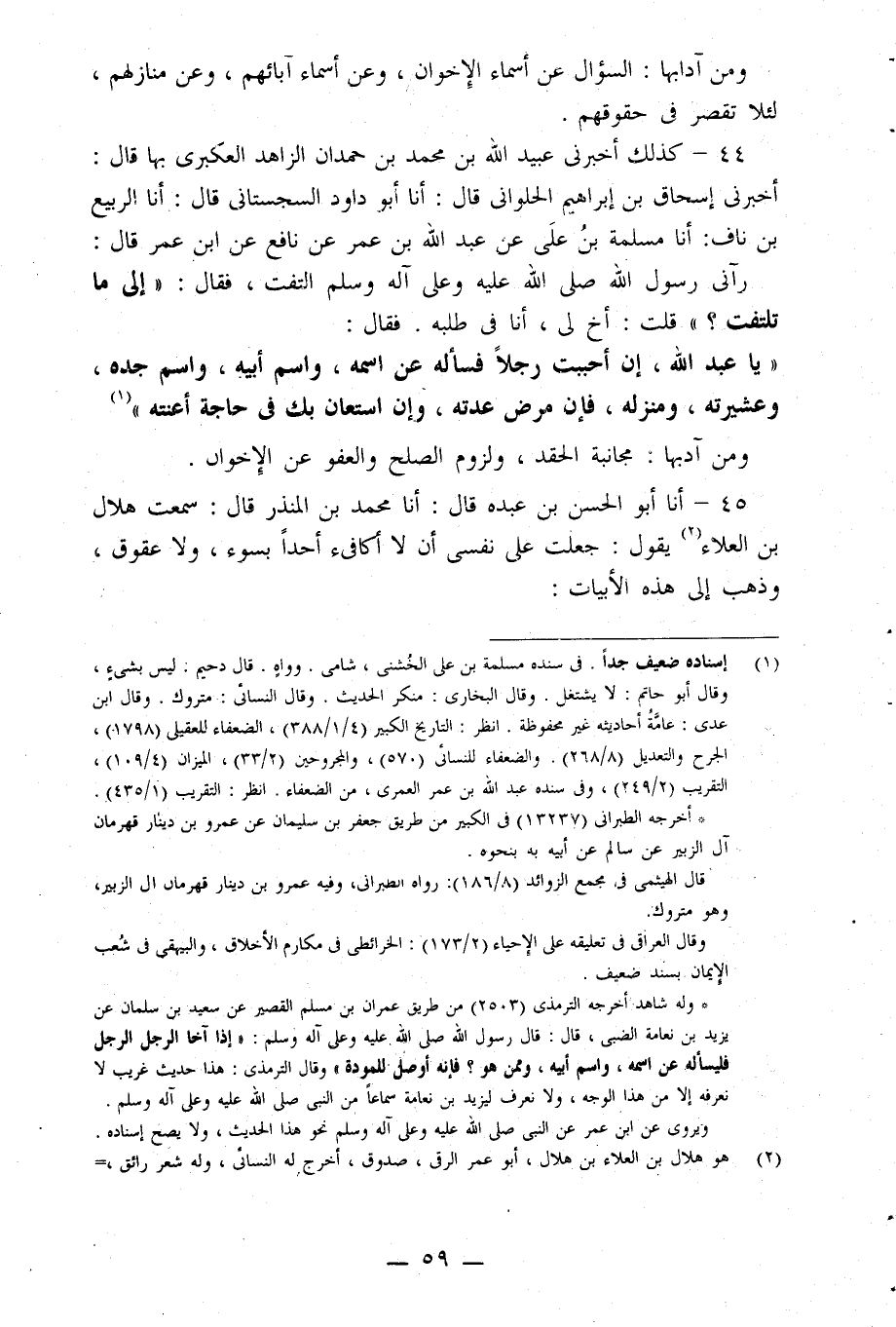 44 - كَذَلِكَ أَخْبَرَنِي عُبَيْدُ اللَّهِ بْنُ مُحَمَّدِ بْنِ حَمْدَانَ الزَّاهِدُ الْعُكْبَرِيُّ بِهَا قَالَ: أَخْبَرَنِي إِسْحَاقُ بْنُ إِبْرَاهِيمَ الْحُلْوَانِيُّ قَالَ: أنا أَبُو دَاوُدَ السِّجِسْتَانِيُّ قَالَ: أنا الرَّبِيعُ بْنُ نَافِعٍ، أنا مَسْلَمَةُ بْنُ عُلَيٍّ، عَنْ عَبْدِ اللَّهِ بْنِ عُمَرَ، عَنْ نَافِعٍ، عَنِ ابْنِ عُمَرَ قَالَ: رَآنِي رَسُولُ اللَّهِ صَلَّى اللَّهُ عَلَيْهِ وَعَلَى آلِهِ وَسَلَّمَ أَلْتَفِتُ فَقَالَ: «§إِلَى مَا تَلْتَفِتُ؟» . قُلْتُ: أَخٌ لِي أَنَا فِي طَلَبِهِ. فَقَالَ: «يَا عَبْدَ اللَّهِ، إِنْ أَحْبَبْتَ رَجُلًا فَاسْأَلْهُ عَنِ اسْمِهِ، وَاسْمِ أَبِيهِ، وَاسْمِ جَدِّهِ، وَعَشِيرَتِهِ، وَمَنْزِلِهِ، فَإِنْ مَرِضَ عُدْتَهُ، وَإِنِ اسْتَعَانَ بِكَ فِي حَاجَةٍ أَعَنْتَهُ» وَمِنْ آدَابِهَا: مُجَانَبَةُ الْحِقْدِ، وَلُزُومُ الصُّلْحِ، وَالْعَفْوُ عَنِ الْإِخْوَانِ