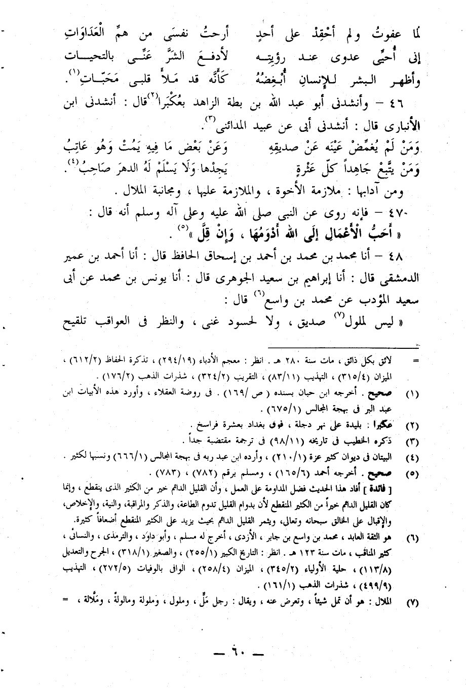 48 - أنا مُحَمَّدُ بْنُ مُحَمَّدِ بْنِ أَحْمَدَ بْنِ إِسْحَاقَ الْحَافِظُ قَالَ: أنا أَحْمَدُ بْنُ عُمَيْرٍ الدِّمَشْقِيُّ قَالَ: أنا إِبْرَاهِيمُ بْنُ سَعِيدٍ الْجَوْهَرِيُّ قَالَ: أنا يُونُسُ بْنُ مُحَمَّدٍ، عَنْ أَبِي سَعِيدٍ الْمُؤَدِّبِ، عَنْ مُحَمَّدِ بْنِ وَاسِعٍ قَالَ: «§لَيْسَ لِمَلُولٍ صِدِّيقٌ، وَلَا لِحَسُودٍ غِنًى، وَالنَّظَرُ فِي الْعَوَاقِبِ تَلْقِيحٌ -[61]- لِلْعُقُولِ» وَمِنْ آدَابِهَا: الْإِغْضَاءُ عَنِ الصَّدِيقِ فِي بَعْضِ الْمَكَارِهِ