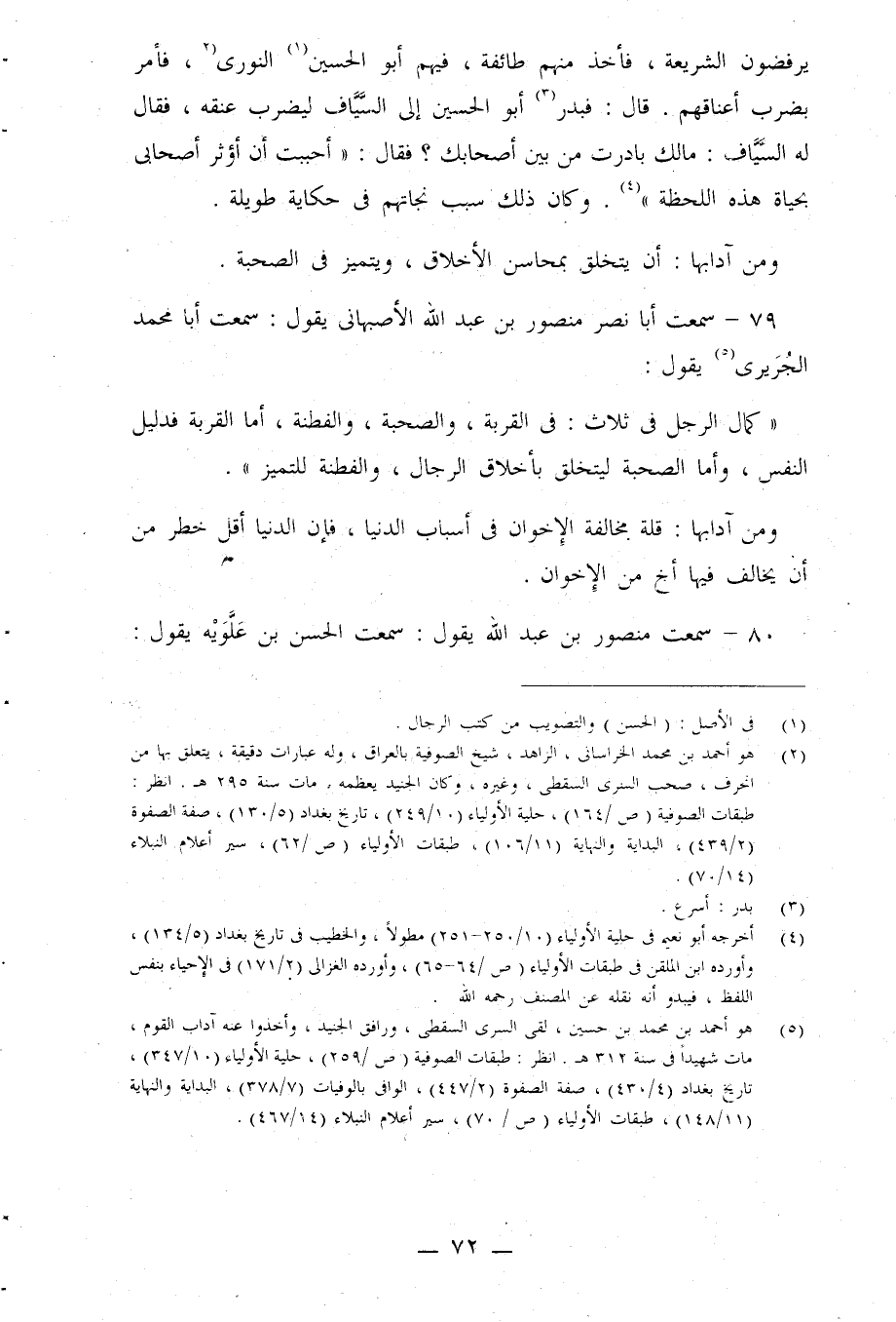 79 - سَمِعْتُ أَبَا نَصْرٍ مَنْصُورَ بْنَ عَبْدِ اللَّهِ الْأَصْبَهَانِيَّ يَقُولُ: سَمِعْتُ أَبَا مُحَمَّدٍ الْجُرَيْرِيَّ يَقُولُ: " §كَمَالُ الرَّجُلِ فِي ثَلَاثٍ: فِي الْقُرْبَةِ، وَالصُّحْبَةِ، وَالْفِطْنَةِ. أَمَّا الْقُرْبَةُ فَدَلِيلُ النَّفْسِ، وَأَمَّا الصُّحْبَةُ لِيَتَخَلَّقَ بِأَخْلَاقِ الرِّجَالِ، وَالْفِطْنَةُ لِلتَّمَيُّزِ " وَمِنْ آدَابِهَا: قِلَّةُ مُخَالَفَةِ الْإِخْوَانِ فِي أَسْبَابِ الدُّنْيَا، فَإِنَّ الدُّنْيَا أَقَلُّ خَطَرًا مِنْ أَنْ يُخَالَفَ فِيهَا أَخٌ مِنَ الْإِخْوَانِ