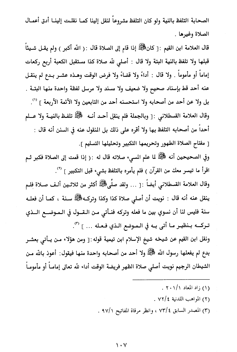 وقال العلامة القسطلاني أيضاً: [ ... ولقد صلَّى - صلى الله عليه وسلم - أكثر من ثلاثين ألف صلاة فلم ينقل عنه أنه قال: نويت أن أصلي صلاة كذا وكذا وتركه - صلى الله عليه وسلم - سنة، كما أن فعله سنة فليس لنا أن نسوي بين ما فعله وتركه فنأتي من القول في الموضع الذي تركه بنظير ما أتى به في الموضع الذي فعله ... ] (¬3).