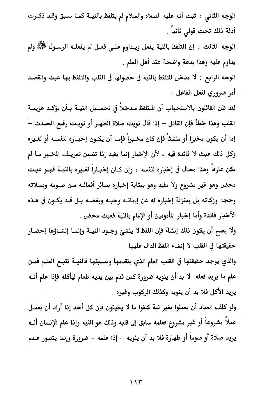 لقد ظن القائلون بالاستحباب أن للتلفظ مدخلاً في تحصيل النية بأن يؤكد عزيمة القلب وهذا خطأ فإن القائل - إذا قال نويت صلاة الظهر أو نويت رفع الحدث - إما أن يكون مخبراً أو منشئاً فإن كان مخبراً فإما أن يكون إخباره لنفسه أو لغيره وكل ذلك عبث لا فائدة فيه، لأن الإخبار إنما يفيد إذا تضمن تعريف المخبر ما لم يكن عارفاً وهذا محال في إخباره لنفسه، وإن كان إخباراً لغيره بالنية فهو عبث محض وهو غير مشروع ولا مفيد وهو بمثابة إخباره بسائر أفعاله من صومه وصلاته وحجه وزكاته بل بمنزلة إخباره له عن إيمانه وحبه وبغضه بل قد يكون في هذه الأخبار فائدة وأما إخبار المأمومين أو الإمام بالنية فعبث محض.