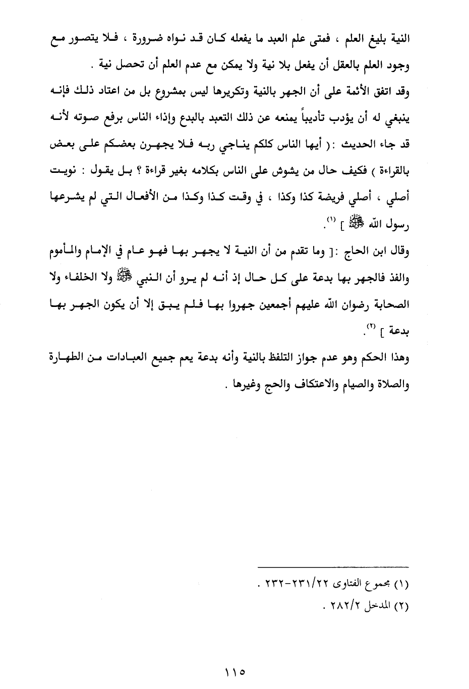 وقال ابن الحاج: [وما تقدم من أن النية لا يجهر بها فهو عام في الإمام والمأموم والفذ فالجهر بها بدعة على كل حال إذ أنه لم يرو أن النبي - صلى الله عليه وسلم - ولا الخلفاء ولا الصحابة رضوان الله عليهم أجمعين جهروا بها فلم يبق إلا أن يكون الجهر بها بدعة] (¬2).