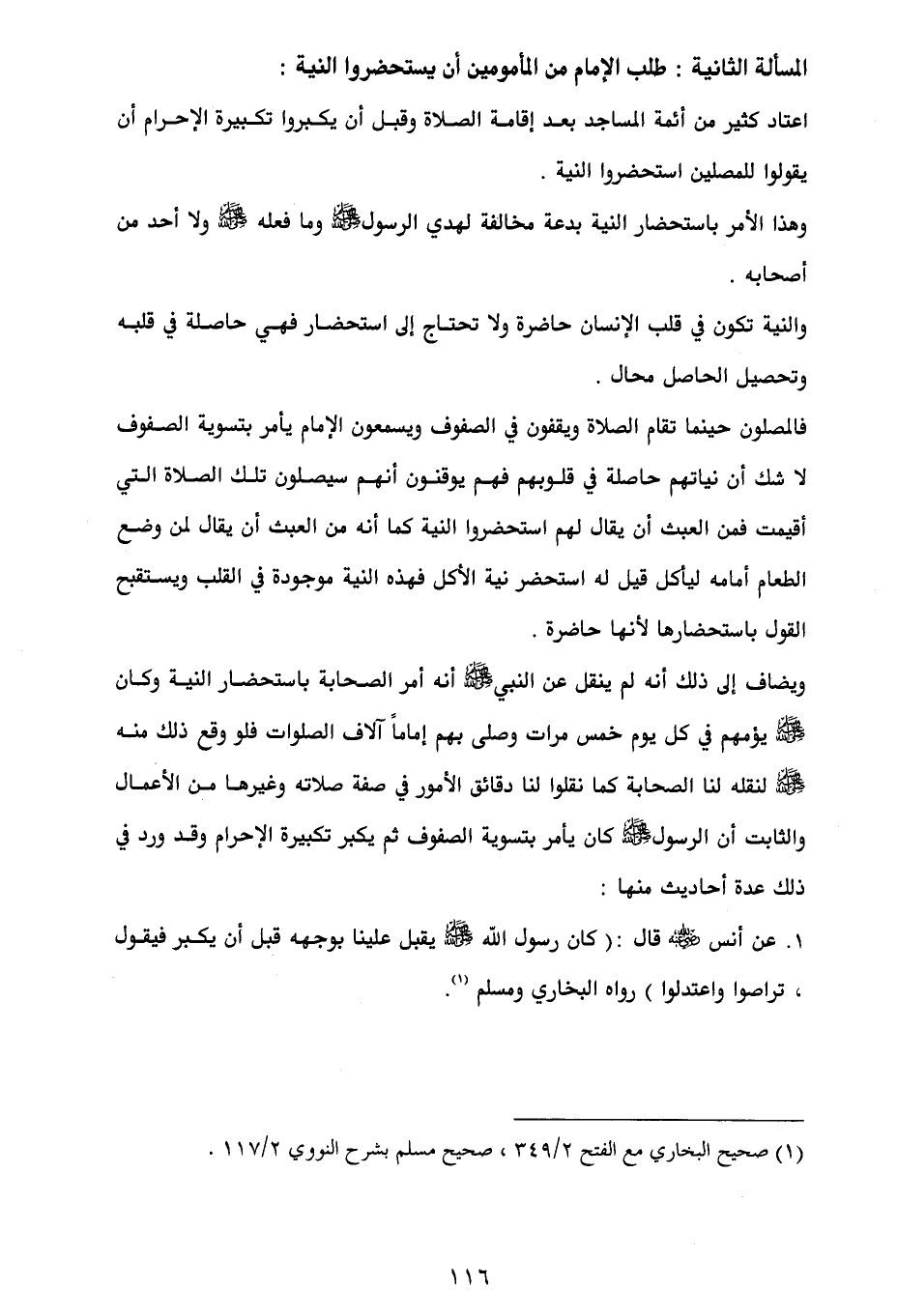 ويضاف إلى ذلك أنه لم ينقل عن النبي - صلى الله عليه وسلم - أنه أمر الصحابة باستحضار النية وكان - صلى الله عليه وسلم - يؤمهم في كل يوم خمس مرات وصلى بهم إماماً آلاف الصلوات فلو وقع ذلك منه - صلى الله عليه وسلم - لنقله لنا الصحابة كما نقلوا لنا دقائق الأمور في صفة صلاته وغيرها من الأعمال والثابت أن الرسول - صلى الله عليه وسلم - كان يأمر بتسوية الصفوف ثم يكبر تكبيرة الإحرام وقد ورد في ذلك عدة أحاديث منها:
