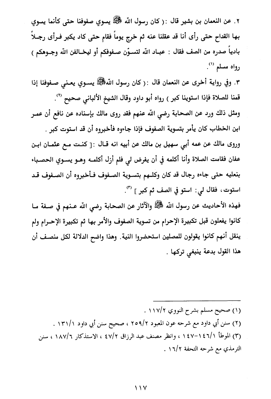 3. وفي رواية أخرى عن النعمان قال: (كان رسول الله - صلى الله عليه وسلم - يسوي يعني صفوفنا إذا قمنا للصلاة فإذا استوينا كبر) رواه أبو داود وقال الشيخ الألباني صحيح (¬2).