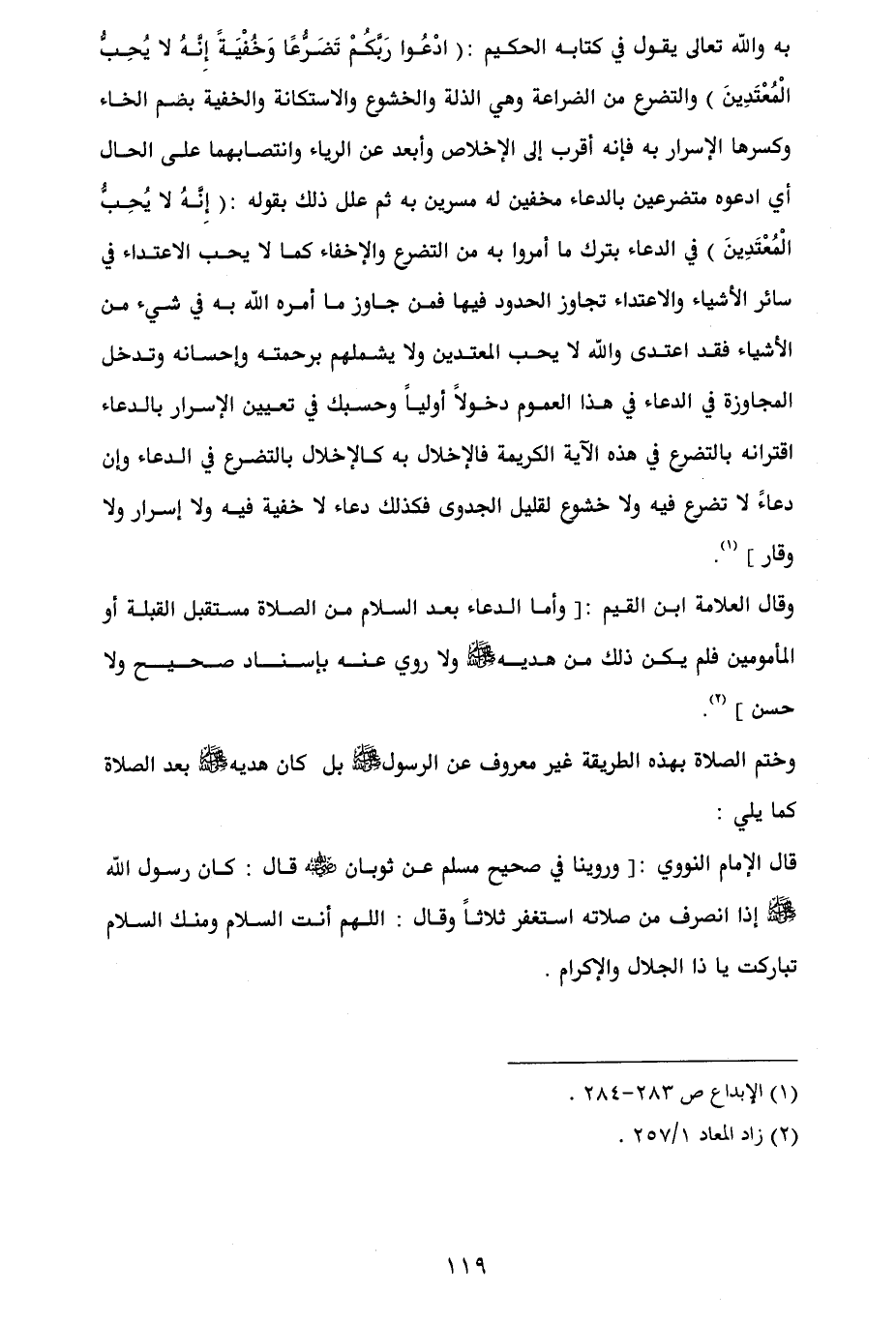 وقال العلامة ابن القيم: [وأما الدعاء بعد السلام من الصلاة مستقبل القبلة أو المأمومين فلم يكن ذلك من هديه - صلى الله عليه وسلم - ولا روي عنه بإسناد صحيح ولا حسن] (¬2).