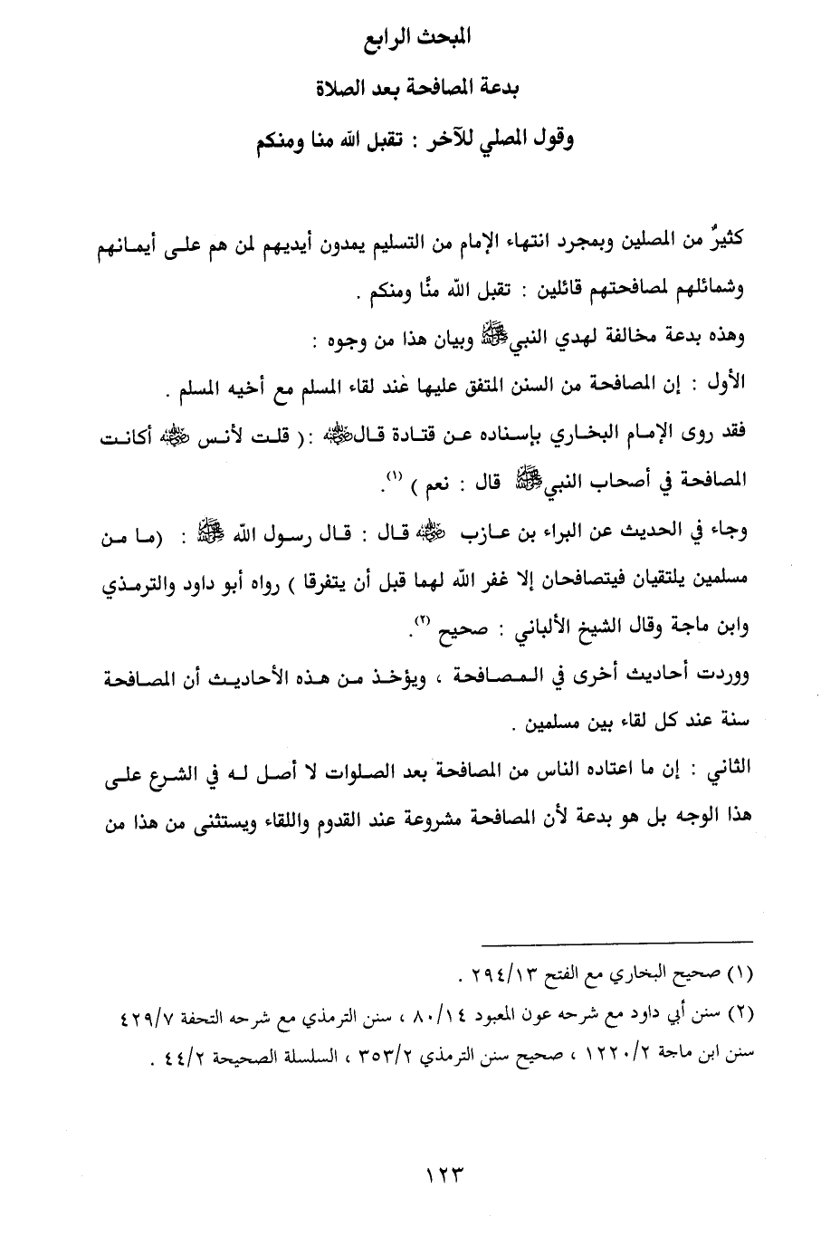 الثاني: إن ما اعتاده الناس من المصافحة بعد الصلوات لا أصل له في الشرع على هذا الوجه بل هو بدعة لأن المصافحة مشروعة عند القدوم واللقاء ويستثنى من هذا من