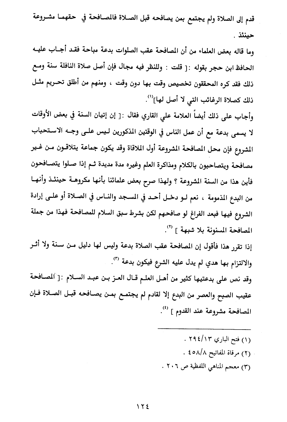 وما قاله بعض العلماء من أن المصافحة عقب الصلوات بدعة مباحة فقد أجاب عليه الحافظ ابن حجر بقوله: [قلت: وللنظر فيه مجال فإن أصل صلاة النافلة سنة ومع ذلك فقد كره المحققون تخصيص وقت بها دون وقت، ومنهم من أطلق تحريم مثل ذلك كصلاة الرغائب التي لا أصل لها] (¬1).
