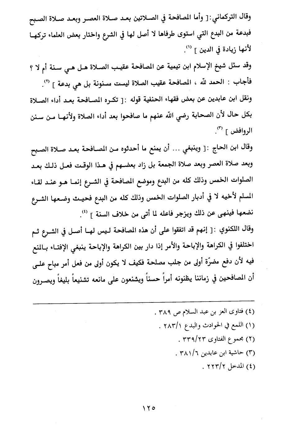 وقال التركماني: [وأما المصافحة في الصلاتين بعد صلاة العصر وبعد صلاة الصبح فبدعة من البدع التي استوى طرفاها لا أصل لها في الشرع واختار بعض العلماء تركها لأنها زيادة في الدين] (¬1).