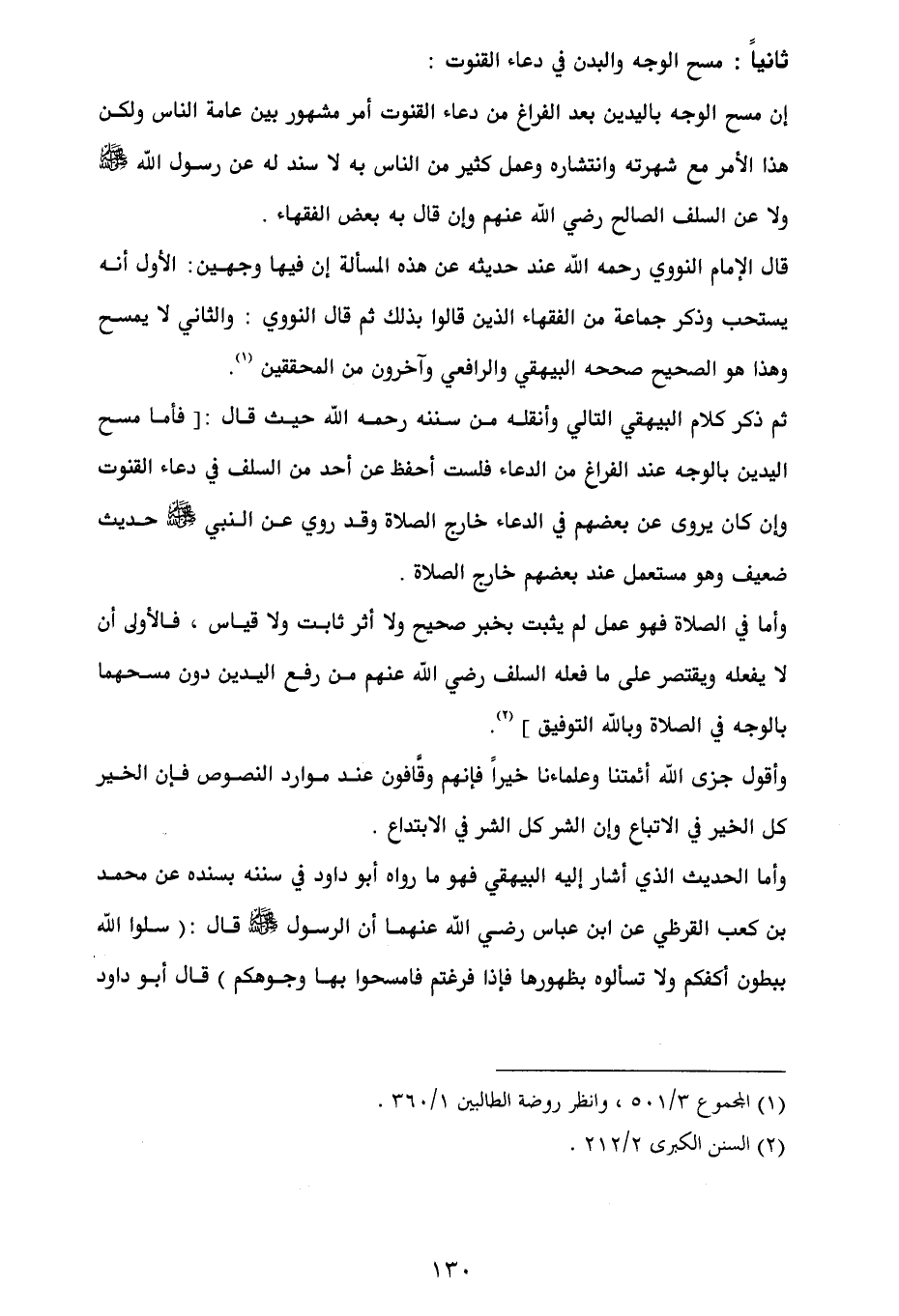 ثم ذكر كلام البيهقي التالي وأنقله من سننه رحمه الله حيث قال: [فأما مسح اليدين بالوجه عند الفراغ من الدعاء فلست أحفظ عن أحد من السلف في دعاء القنوت وإن كان يروى عن بعضهم في الدعاء خارج الصلاة وقد روي عن النبي - صلى الله عليه وسلم - حديث ضعيف وهو مستعمل عند بعضهم خارج الصلاة.