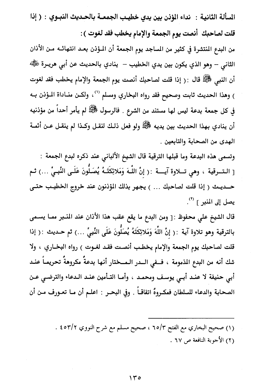 المسألة الثانية: نداء المؤذن بين يدي خطيب الجمعة بالحديث النبوي: (إذا قلت لصاحبك أنصت يوم الجمعة والإمام يخطب فقد لغوت):
