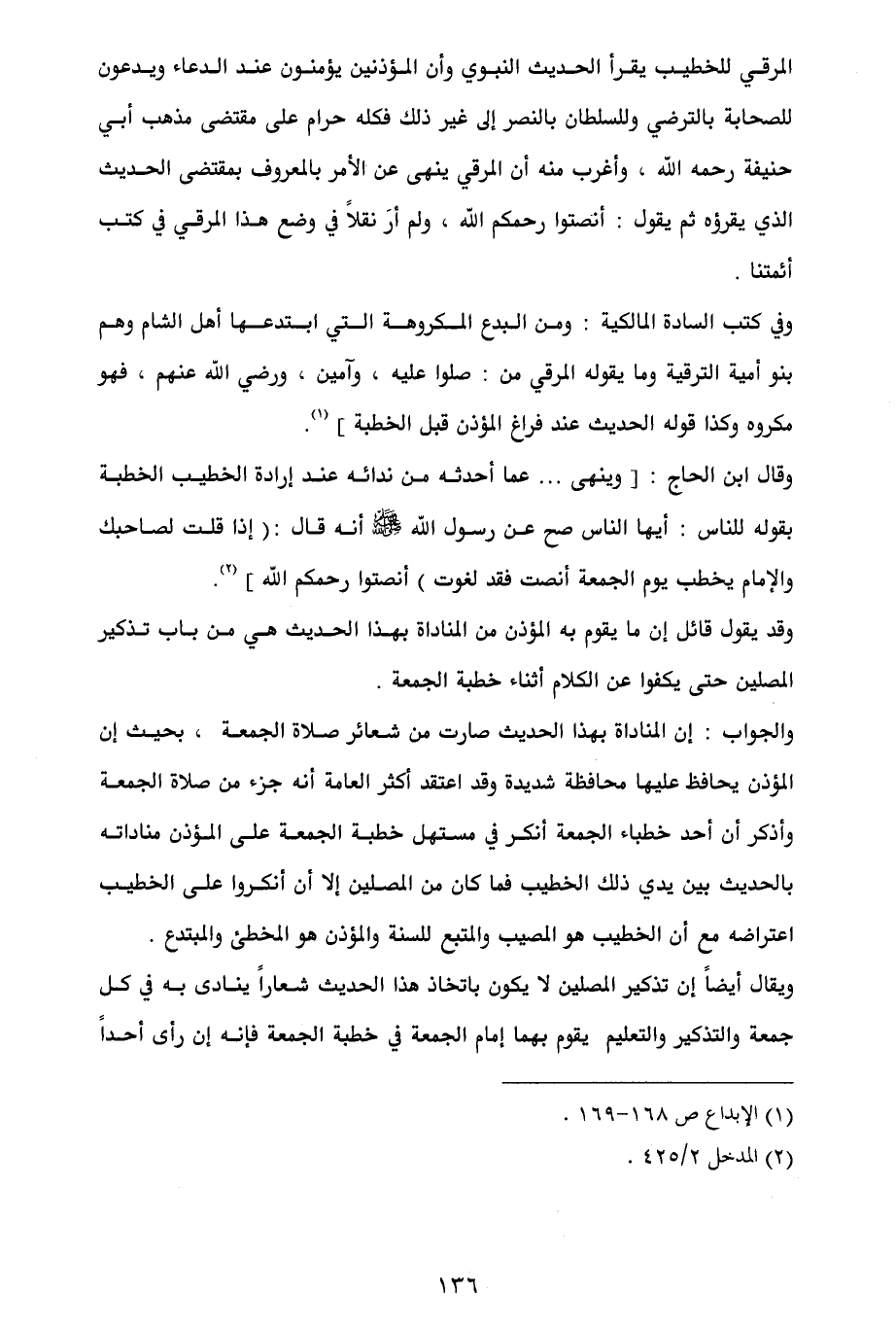 المرقي للخطيب يقرأ الحديث النبوي وأن المؤذنين يؤمنون عند الدعاء ويدعون للصحابة بالترضي وللسلطان بالنصر إلى غير ذلك فكله حرام على مقتضى مذهب أبي حنيفة رحمه الله، وأغرب منه أن المرقي ينهى عن الأمر بالمعروف بمقتضى الحديث الذي يقرؤه ثم يقول: أنصتوا رحمكم الله، ولم أرَ نقلاً في وضع هذا المرقي في كتب أئمتنا.