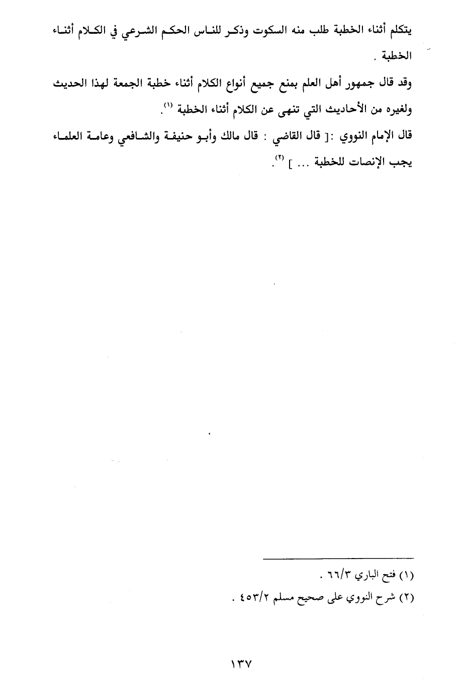 وقد قال جمهور أهل العلم بمنع جميع أنواع الكلام أثناء خطبة الجمعة لهذا الحديث ولغيره من الأحاديث التي تنهى عن الكلام أثناء الخطبة (¬1).
