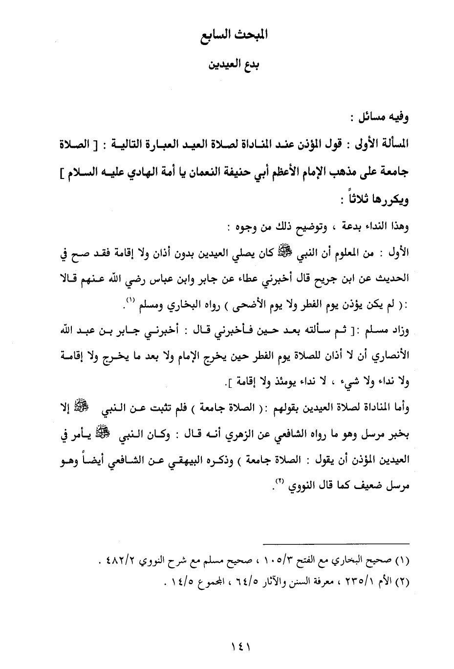 المسألة الأولى: قول المؤذن عند المناداة لصلاة العيد العبارة التالية: [الصلاة جامعة على مذهب الإمام الأعظم أبي حنيفة النعمان يا أمة الهادي عليه السلام] ويكررها ثلاثاً: