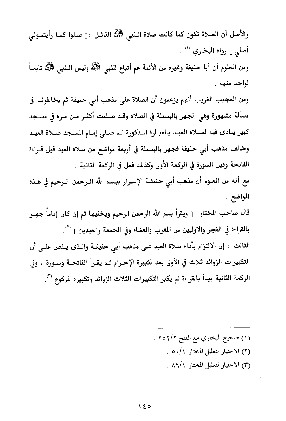 الثالث: إن الالتزام بأداء صلاة العيد على مذهب أبي حنيفة والذي ينص على أن التكبيرات الزوائد ثلاث في الأولى بعد تكبيرة الإحرام ثم يقرأ الفاتحة وسورة، وفي الركعة الثانية يبدأ بالقراءة ثم يكبر التكبيرات الثلاث الزوائد وتكبيرة للركوع (¬3).
