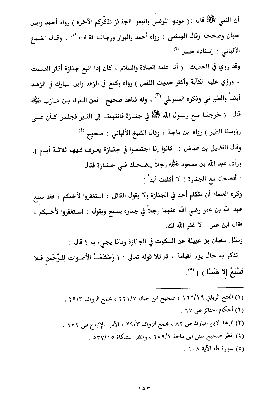 وقد روي في الحديث: (أنه عليه الصلاة والسلام، كان إذا اتبع جنازة أكثر الصمت، ورؤي عليه الكآبة وأكثر حديث النفس) رواه وكيع في الزهد وابن المبارك في الزهد أيضاً والطبراني وذكره السيوطي (¬3)، وله شاهد صحيح. فعن البراء بن عازب - رضي الله عنه - قال: (خرجنا مع رسول الله - صلى الله عليه وسلم - في جنازة فانتهينا إلى القبر فجلس كأن على رؤوسنا الطير) رواه ابن ماجة، وقال الشيخ الألباني: صحيح (¬4)