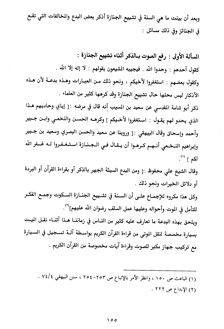 واعلم أن الصواب المختار ما كان عليه السلف رضوان الله عليهم السكوت في حال السير مع الجنازة، فلا يرفع صوتاً بقراءة ولا ذكر ولا غير ذلك، والحكمة فيه ظاهرة وهي أنه أسكن لخاطره وأجمع لفكره فيما يتعلق بالجنازة وهو المطلوب في هذا الحال، فهذا هو الحق ولا تغترنّ بكثرة من يخالفه، فقد قال أبو علي الفضيل بن عياض - رضي الله عنه - ما معناه: الزم طرق الهدى ولا يضرك قلة السالكين وإياك وطرق الضلالة ولا تغتر بكثرة الهالكين] (¬3).