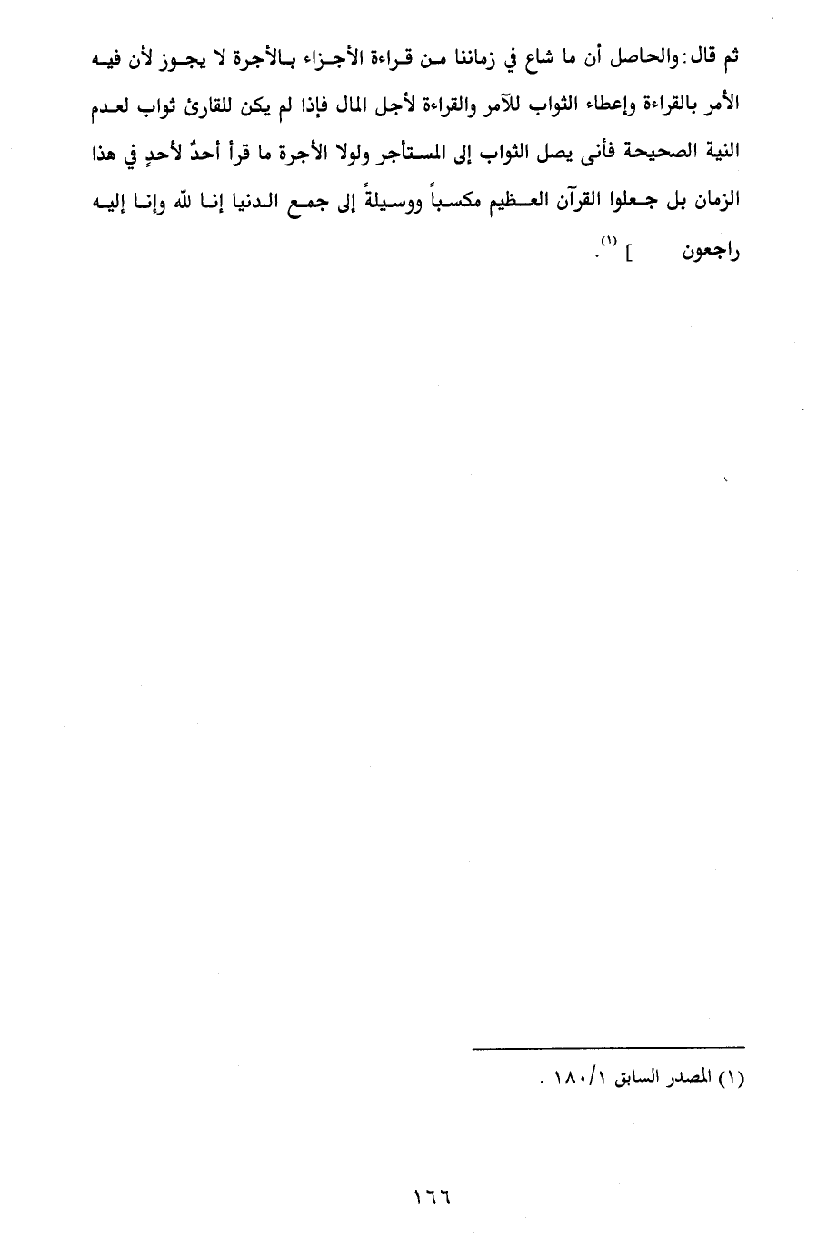 ثم قال: والحاصل أن ما شاع في زماننا من قراءة الأجزاء بالأجرة لا يجوز لأن فيه الأمر بالقراءة وإعطاء الثواب للآمر والقراءة لأجل المال فإذا لم يكن للقارئ ثواب لعدم النية الصحيحة فأنى يصل الثواب إلى المستأجر ولولا الأجرة ما قرأ أحدٌ لأحدٍ في هذا الزمان بل جعلوا القرآن العظيم مكسباً ووسيلةً إلى جمع الدنيا إنا لله وإنا إليه راجعون ... ] (¬1).