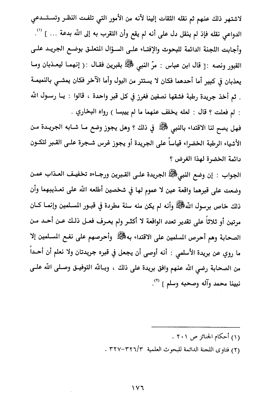وأجابت اللجنة الدائمة للبحوث والإفتاء على السؤال المتعلق بوضع الجريد على القبور ونصه: [قال ابن عباس: مرّ النبي - صلى الله عليه وسلم - بقبرين فقال: (إنهما ليعذبان وما يعذبان في كبير أما أحدهما فكان لا يستتر من البول وأما الآخر فكان يمشي بالنميمة. ثم أخذ جريدة رطبة فشقها نصفين فغرز في كل قبر واحدة، قالوا: يا رسول الله: لم فعلت؟ قال: لعله يخفف عنهما ما لم ييبسا) رواه البخاري.