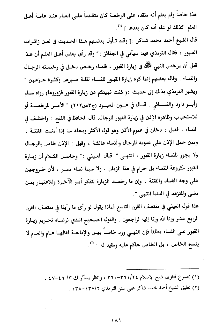 هذا قول العيني في منتصف القرن التاسع فماذا يقول لو رأى ما رأينا في منتصف القرن الرابع عشر وإنا لله وإنا إليه لراجعون. والقول الصحيح الذي نرضاه تحريم زيارة القبور على النساء مطلقاً فإن النهي ورد خاصاً بهن والإباحة لفظها عام والعام لا ينسخ الخاص، بل الخاص حاكم عليه ومقيد له] (¬2).