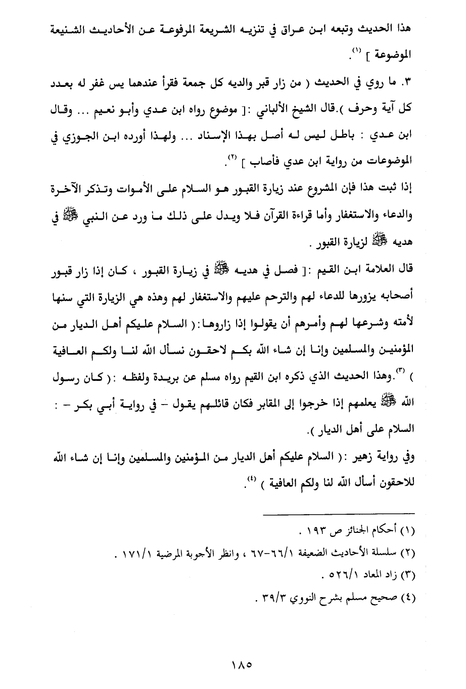 3. ما روي في الحديث (من زار قبر والديه كل جمعة فقرأ عندهما يس غفر له بعدد كل آية وحرف).قال الشيخ الألباني: [موضوع رواه ابن عدي وأبو نعيم ... وقال ابن عدي: باطل ليس له أصل بهذا الإسناد ... ولهذا أورده ابن الجوزي في الموضوعات من رواية ابن عدي فأصاب] (¬2).