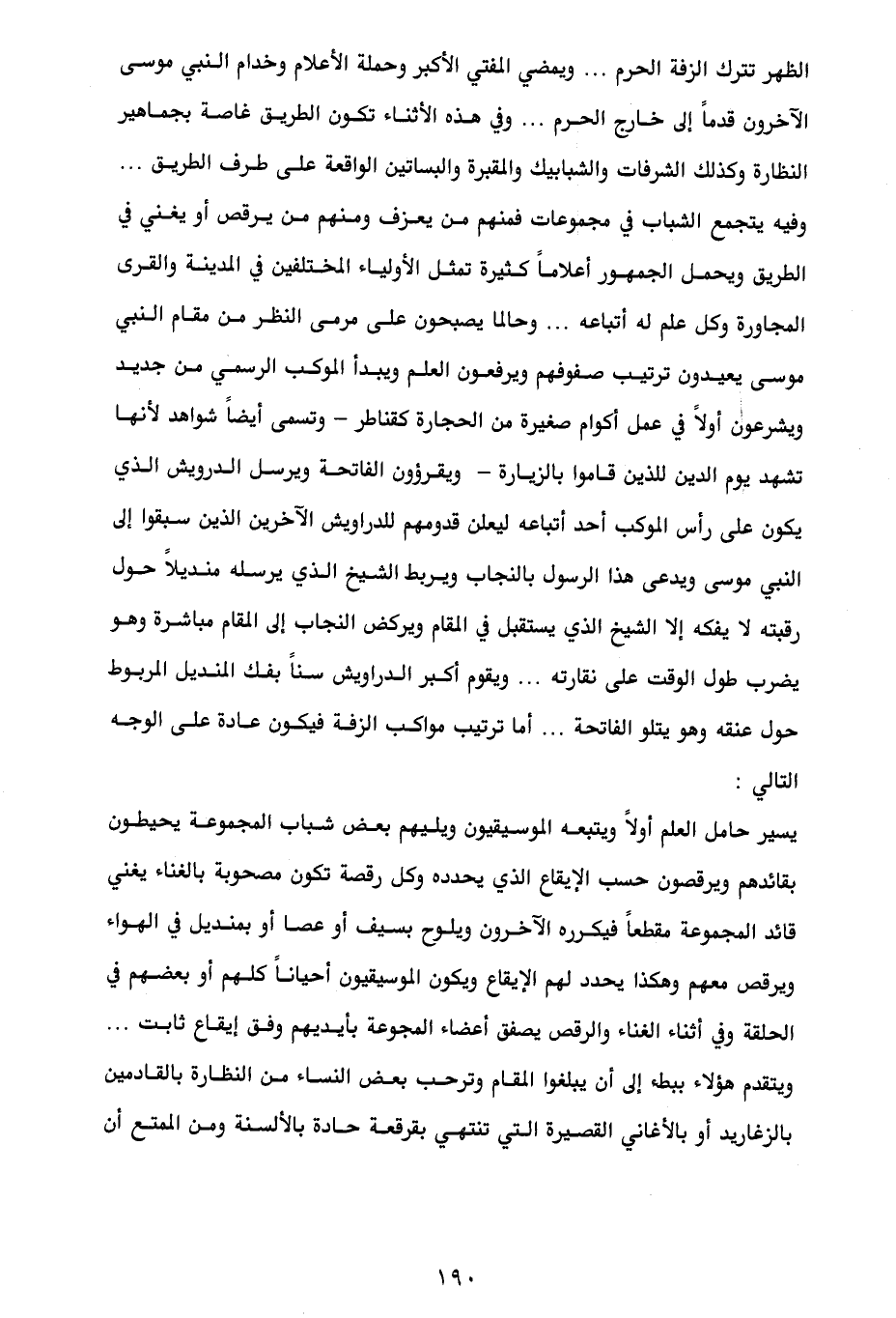 يسير حامل العلم أولاً ويتبعه الموسيقيون ويليهم بعض شباب المجموعة يحيطون بقائدهم ويرقصون حسب الإيقاع الذي يحدده وكل رقصة تكون مصحوبة بالغناء يغني قائد المجموعة مقطعاً فيكرره الآخرون ويلوح بسيف أو عصا أو بمنديل في الهواء ويرقص معهم وهكذا يحدد لهم الإيقاع ويكون الموسيقيون أحياناً كلهم أو بعضهم في الحلقة وفي أثناء الغناء والرقص يصفق أعضاء المجوعة بأيديهم وفق إيقاع ثابت ... ويتقدم هؤلاء ببطء إلى أن يبلغوا المقام وترحب بعض النساء من النظارة بالقادمين بالزغاريد أو بالأغاني القصيرة التي تنتهي بقرقعة حادة بالألسنة ومن الممتع أن