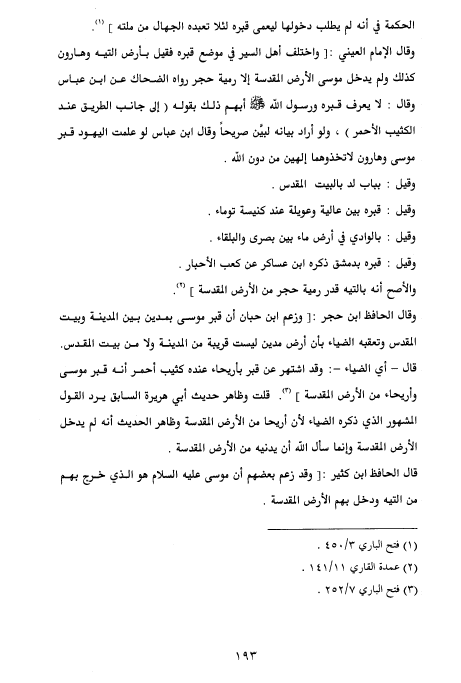 وقال الإمام العيني: [واختلف أهل السير في موضع قبره فقيل بأرض التيه وهارون كذلك ولم يدخل موسى الأرض المقدسة إلا رمية حجر رواه الضحاك عن ابن عباس وقال: لا يعرف قبره ورسول الله - صلى الله عليه وسلم - أبهم ذلك بقوله (إلى جانب الطريق عند الكثيب الأحمر)، ولو أراد بيانه لبيَّن صريحاً وقال ابن عباس لو علمت اليهود قبر موسى وهارون لاتخذوهما إلهين من دون الله.