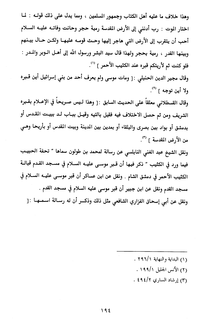 وهذا خلاف ما عليه أهل الكتاب وجمهور المسلمين، ومما يدل على ذلك قوله: لما اختار الموت: رب أدنني إلى الأرض المقدسة رمية حجر وحانت وفاته عليه السلام أحب أن يتقرب إلى الأرض التي هاجر إليها وحث قومه عليها ولكن حال بينهم وبينها القدر، رمية بحجر ولهذا قال سيد البشر ورسول الله إلى أهل الوبر والمدر: فلو كنت ثم لأريتكم قبره عند الكثيب الأحمر] (¬1).