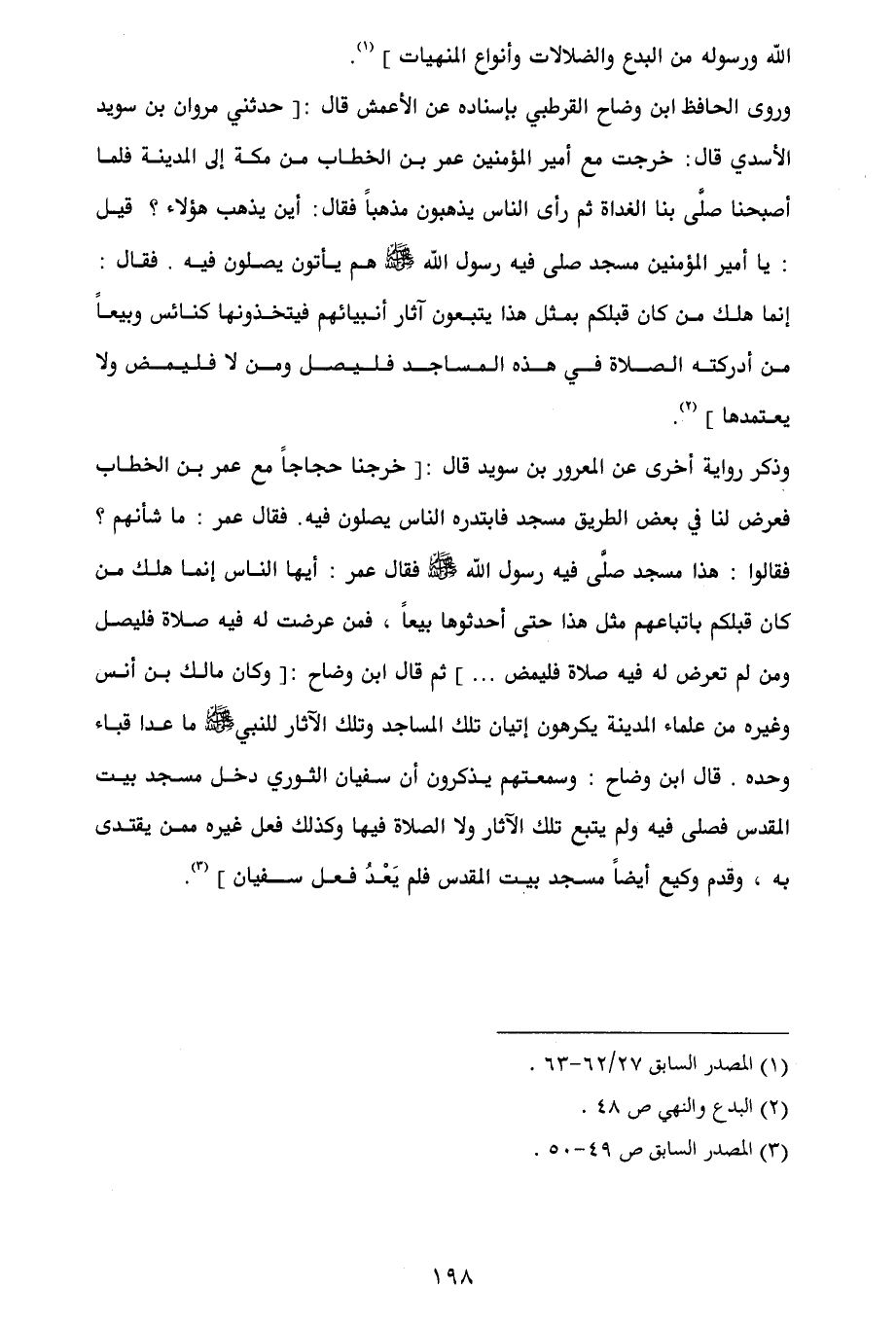 وذكر رواية أخرى عن المعرور بن سويد قال: [خرجنا حجاجاً مع عمر بن الخطاب فعرض لنا في بعض الطريق مسجد فابتدره الناس يصلون فيه. فقال عمر: ما شأنهم؟ فقالوا: هذا مسجد صلَّى فيه رسول الله - صلى الله عليه وسلم - فقال عمر: أيها الناس إنما هلك من كان قبلكم باتباعهم مثل هذا حتى أحدثوها بيعاً، فمن عرضت له فيه صلاة فليصل ومن لم تعرض له فيه صلاة فليمض ... ] ثم قال ابن وضاح: [وكان مالك بن أنس وغيره من علماء المدينة يكرهون إتيان تلك المساجد وتلك الآثار للنبي - صلى الله عليه وسلم - ما عدا قباء وحده. قال ابن وضاح: وسمعتهم يذكرون أن سفيان الثوري دخل مسجد بيت المقدس فصلى فيه ولم يتبع تلك الآثار ولا الصلاة فيها وكذلك فعل غيره ممن يقتدى به، وقدم وكيع أيضاً مسجد بيت المقدس فلم يَعْدُ فعل سفيان] (¬3).