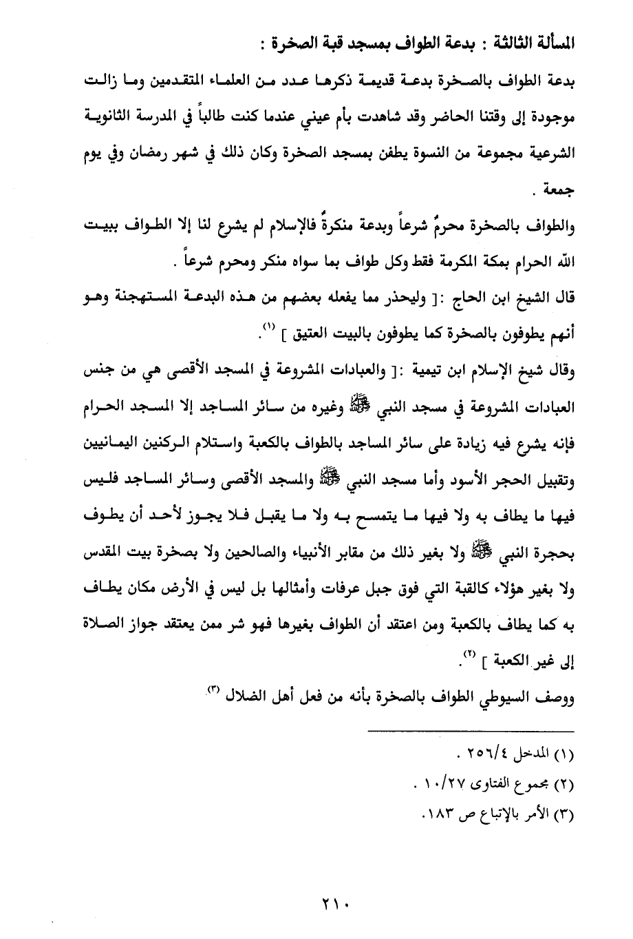 وقال شيخ الإسلام ابن تيمية: [والعبادات المشروعة في المسجد الأقصى هي من جنس العبادات المشروعة في مسجد النبي - صلى الله عليه وسلم - وغيره من سائر المساجد إلا المسجد الحرام فإنه يشرع فيه زيادة على سائر المساجد بالطواف بالكعبة واستلام الركنين اليمانيين وتقبيل الحجر الأسود وأما مسجد النبي - صلى الله عليه وسلم - والمسجد الأقصى وسائر المساجد فليس فيها ما يطاف به ولا فيها ما يتمسح به ولا ما يقبل فلا يجوز لأحد أن يطوف بحجرة النبي - صلى الله عليه وسلم - ولا بغير ذلك من مقابر الأنبياء والصالحين ولا بصخرة بيت المقدس ولا بغير هؤلاء كالقبة التي فوق جبل عرفات وأمثالها بل ليس في الأرض مكان يطاف به كما يطاف بالكعبة ومن اعتقد أن الطواف بغيرها فهو شر ممن يعتقد جواز الصلاة إلى غير الكعبة] (¬2).