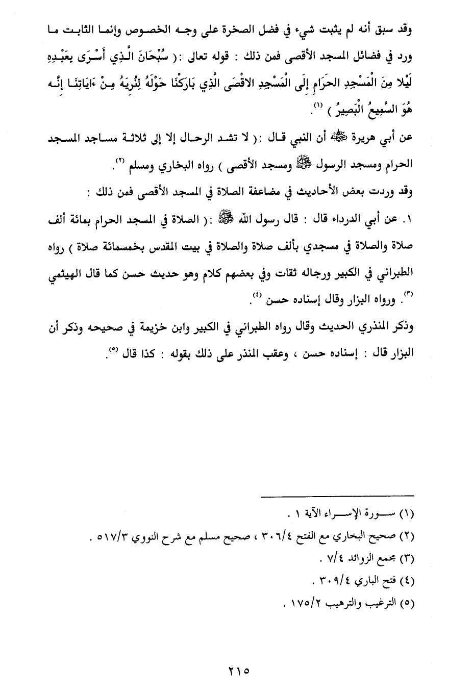 1. عن أبي الدرداء قال: قال رسول الله - صلى الله عليه وسلم -: (الصلاة في المسجد الحرام بمائة ألف صلاة والصلاة في مسجدي بألف صلاة والصلاة في بيت المقدس بخمسمائة صلاة) رواه الطبراني في الكبير ورجاله ثقات وفي بعضهم كلام وهو حديث حسن كما قال الهيثمي (¬3). ورواه البزار وقال إسناده حسن (¬4).