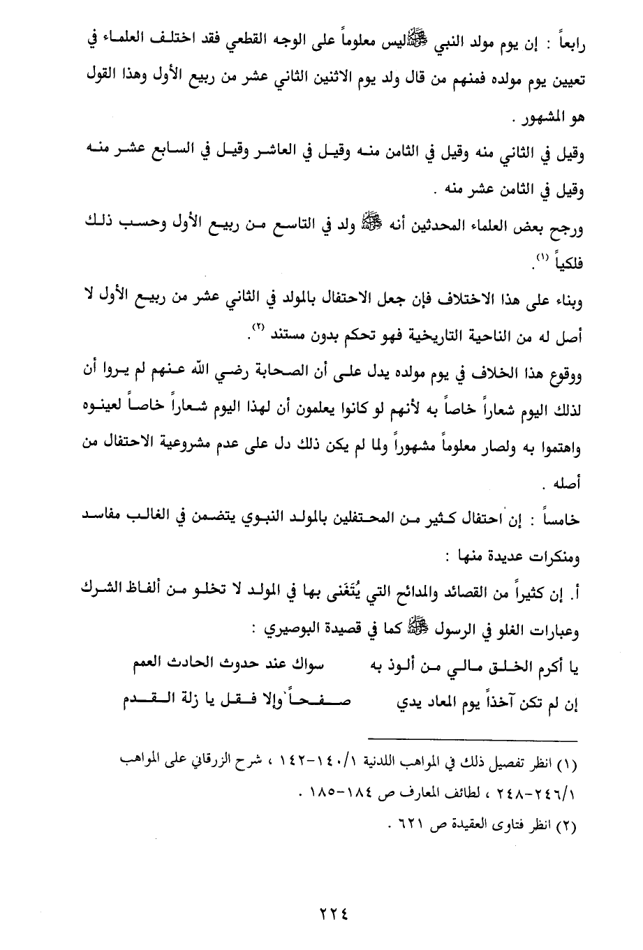 رابعاً: إن يوم مولد النبي - صلى الله عليه وسلم - ليس معلوماً على الوجه القطعي فقد اختلف العلماء في تعيين يوم مولده فمنهم من قال ولد يوم الاثنين الثاني عشر من ربيع الأول وهذا القول هو المشهور.
