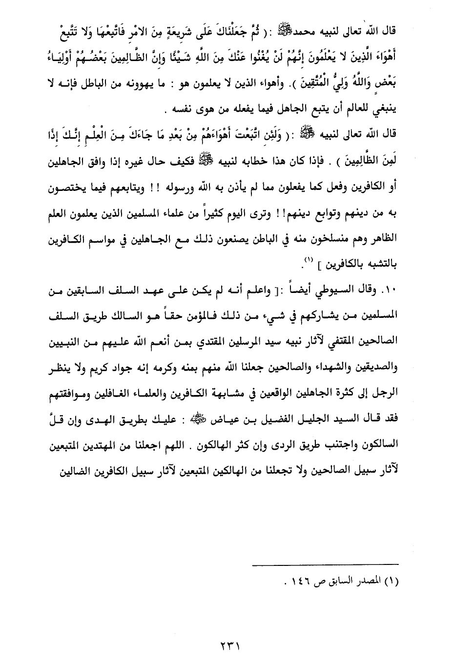 10. وقال السيوطي أيضاً: [واعلم أنه لم يكن على عهد السلف السابقين من المسلمين من يشاركهم في شيء من ذلك فالمؤمن حقاً هو السالك طريق السلف الصالحين المقتفي لآثار نبيه سيد المرسلين المقتدي بمن أنعم الله عليهم من النبيين والصديقين والشهداء والصالحين جعلنا الله منهم بمنه وكرمه إنه جواد كريم ولا ينظر الرجل إلى كثرة الجاهلين الواقعين في مشابهة الكافرين والعلماء الغافلين وموافقتهم فقد قال السيد الجليل الفضيل بن عياض - رضي الله عنه -: عليك بطريق الهدى وإن قلَّ السالكون واجتنب طريق الردى وإن كثر الهالكون. اللهم اجعلنا من المهتدين المتبعين لآثار سبيل الصالحين ولا تجعلنا من الهالكين المتبعين لآثار سبيل الكافرين الضالين