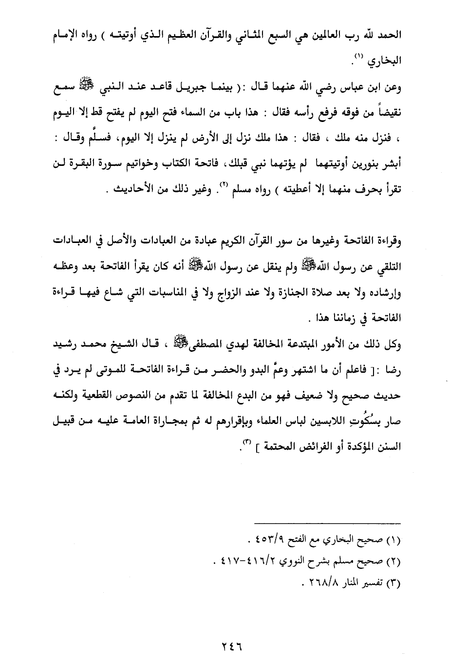 وكل ذلك من الأمور المبتدعة المخالفة لهدي المصطفى - صلى الله عليه وسلم -، قال الشيخ محمد رشيد رضا: [فاعلم أن ما اشتهر وعمَّ البدو والحضر من قراءة الفاتحة للموتى لم يرد في حديث صحيح ولا ضعيف فهو من البدع المخالفة لما تقدم من النصوص القطعية ولكنه صار بِسُكُوتِ اللابسين لباس العلماء وبإقرارهم له ثم بمجاراة العامة عليه من قبيل السنن المؤكدة أو الفرائض المحتمة] (¬3).