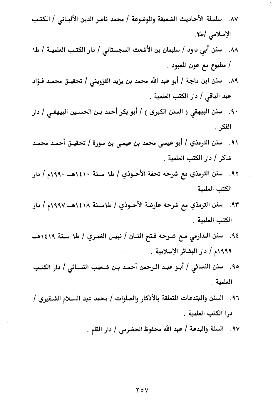 96. السنن والمبتدعات المتعلقة بالأذكار والصلوات / محمد عبد السلام الشقيري / درا الكتب العلمية.