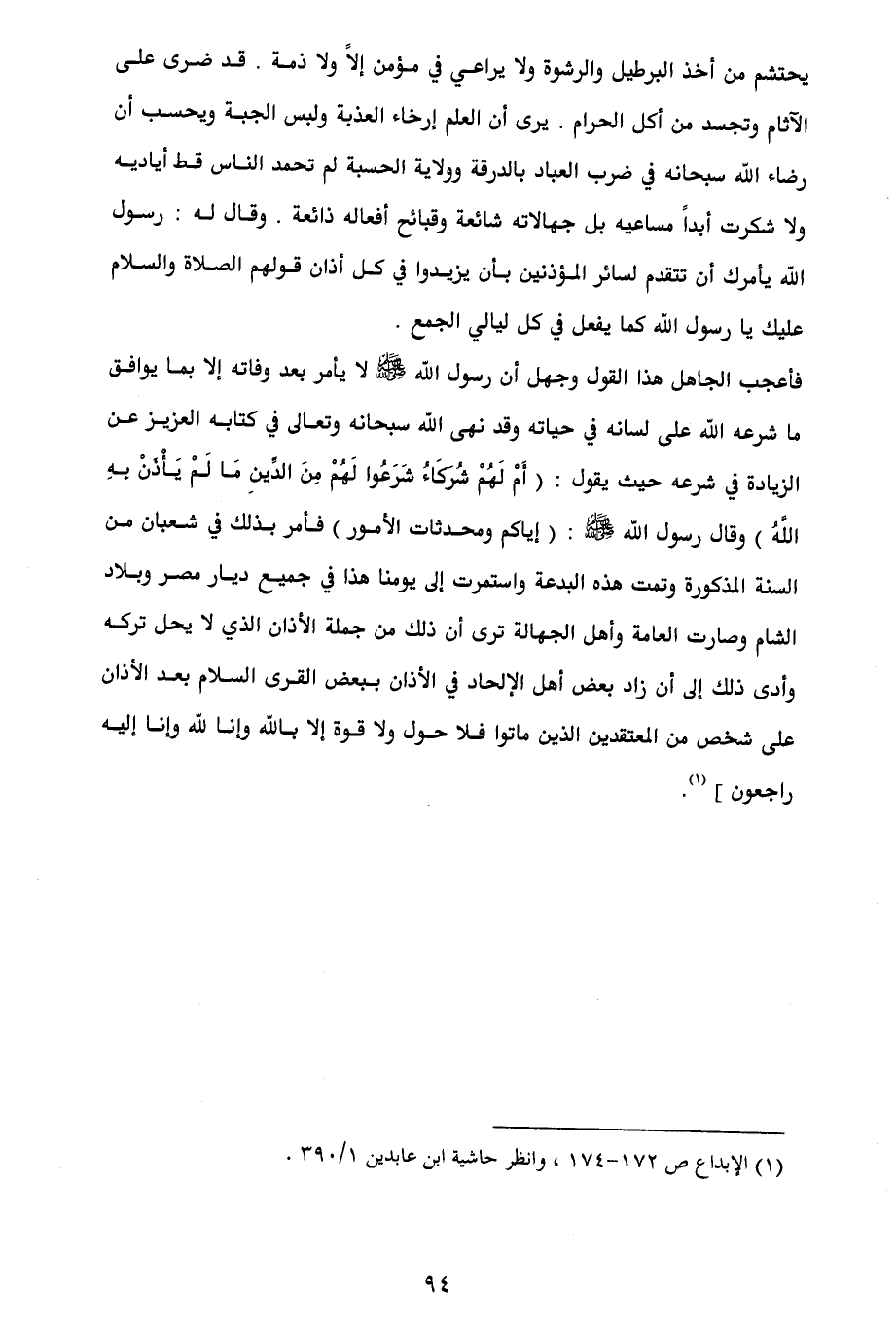 فأعجب الجاهل هذا القول وجهل أن رسول الله - صلى الله عليه وسلم - لا يأمر بعد وفاته إلا بما يوافق ما شرعه الله على لسانه في حياته وقد نهى الله سبحانه وتعالى في كتابه العزيز عن الزيادة في شرعه حيث يقول: (أَمْ لَهُمْ شُرَكَاءُ شَرَعُوا لَهُمْ مِنَ الدِّينِ مَا لَمْ يَأْذَنْ بِهِ اللَّهُ) وقال رسول الله - صلى الله عليه وسلم -: (إياكم ومحدثات الأمور) فأمر بذلك في شعبان من السنة المذكورة وتمت هذه البدعة واستمرت إلى يومنا هذا في جميع ديار مصر وبلاد الشام وصارت العامة وأهل الجهالة ترى أن ذلك من جملة الأذان الذي لا يحل تركه وأدى ذلك إلى أن زاد بعض أهل الإلحاد في الأذان ببعض القرى السلام بعد الأذان على شخص من المعتقدين الذين ماتوا فلا حول ولا قوة إلا بالله وإنا لله وإنا إليه راجعون] (¬1).