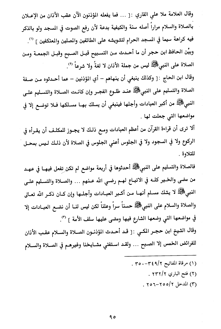 وقال ابن الحاج: [وكذلك ينبغي أن ينهاهم - أي المؤذنين - عما أحدثوه من صفة الصلاة والتسليم على النبي - صلى الله عليه وسلم - عند طلوع الفجر وإن كانت الصلاة والتسليم على النبي - صلى الله عليه وسلم - من أكبر العبادات وأجلها فينبغي أن يسلك بها مسلكها فلا توضع إلا في مواضعها التي جعلت لها.