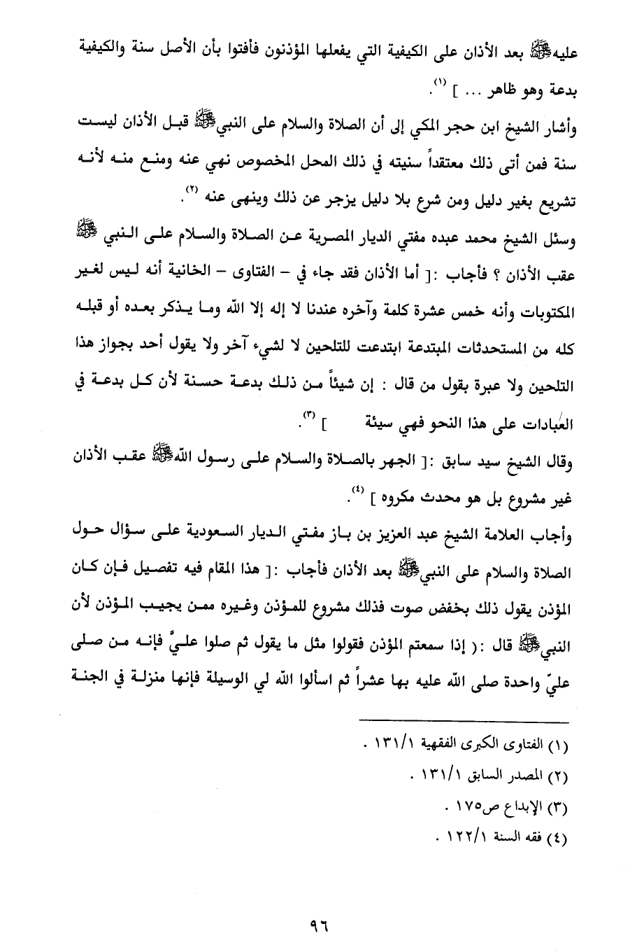 وقال الشيخ سيد سابق: [الجهر بالصلاة والسلام على رسول الله - صلى الله عليه وسلم - عقب الأذان غير مشروع بل هو محدث مكروه] (¬4).