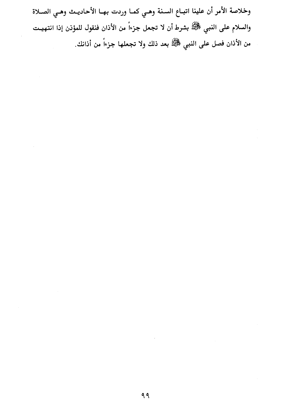 وخلاصة الأمر أن علينا اتباع السنة وهي كما وردت بها الأحاديث وهي الصلاة والسلام على النبي - صلى الله عليه وسلم - بشرط أن لا تجعل جزءاً من الأذان فنقول للمؤذن إذا انتهيت من الأذان فصل على النبي - صلى الله عليه وسلم - بعد ذلك ولا تجعلها جزءاً من أذانك.